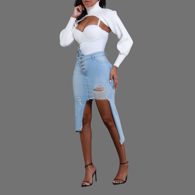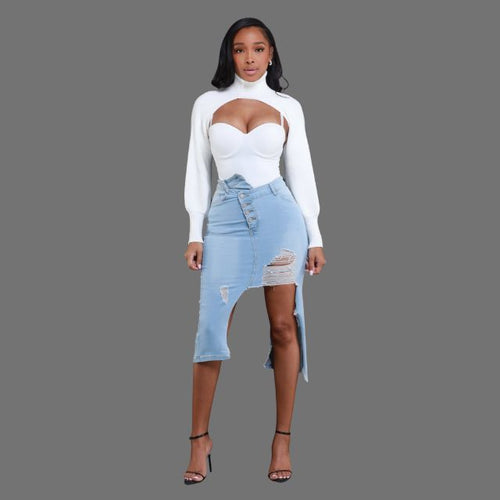 Upplev en stilfull look med denna jeanskjol som kombinerar modern design med en unik silhuett. Den vågiga sidospåren ger en iögonfallande detalj som gör att du kan sticka ut i mängden.