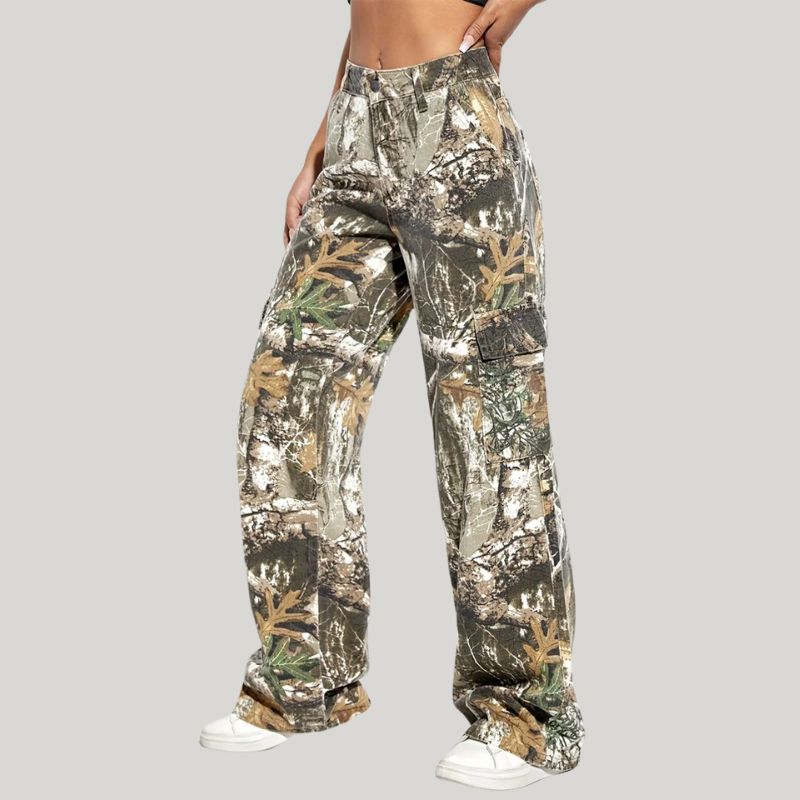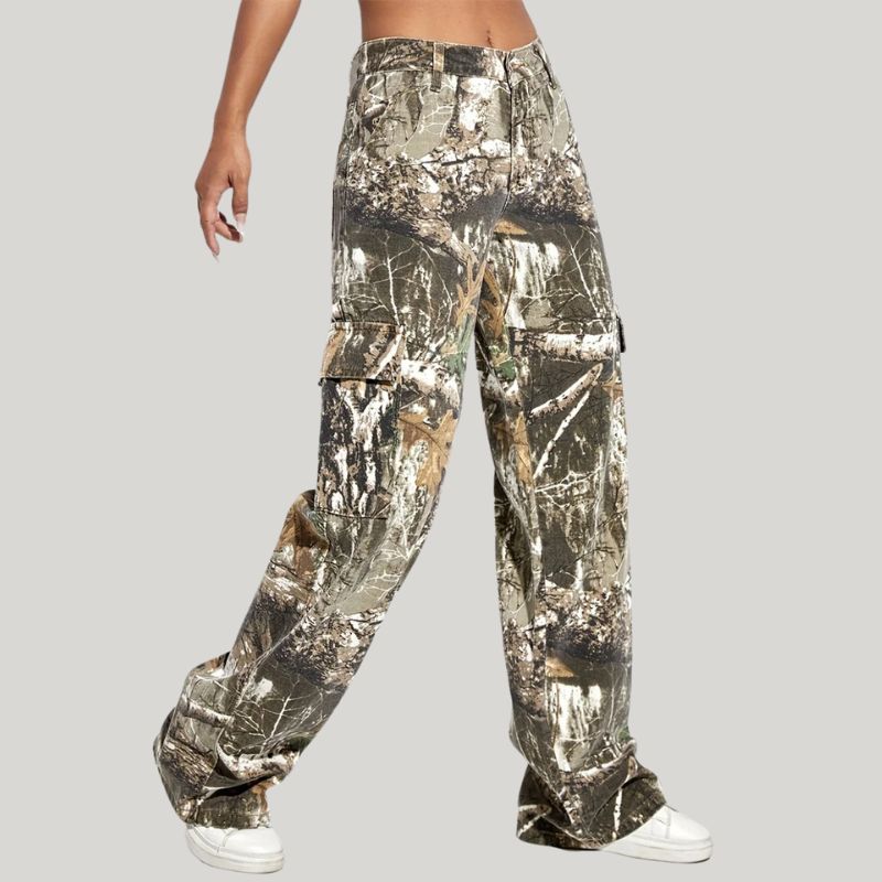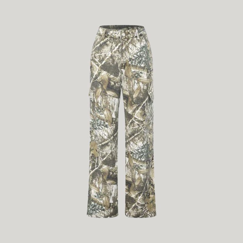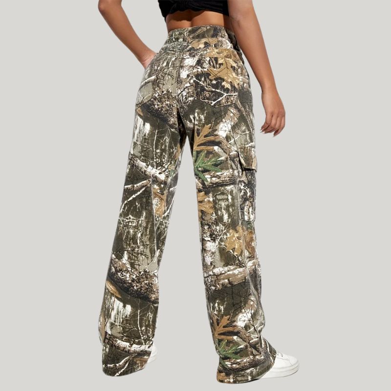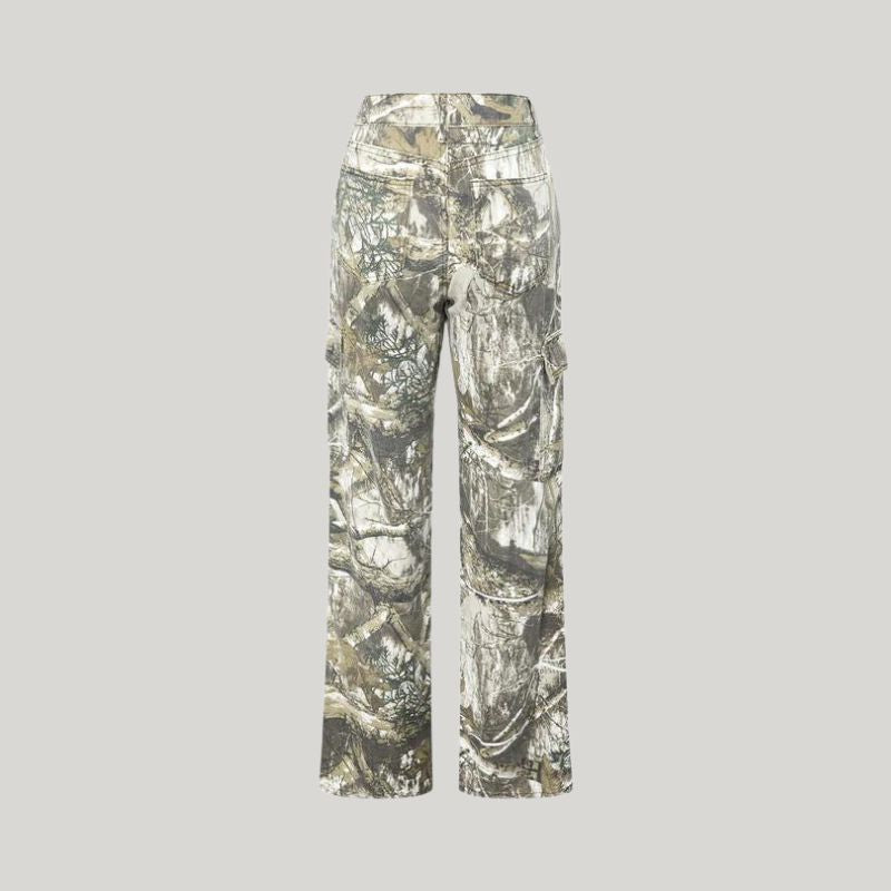 Upplev naturen med dessa stiliga kamouflagebyxor som kombinerar funktion och mode. Med en hög midja och praktiska fickor är de perfekta för äventyr eller avslappnade dagar.