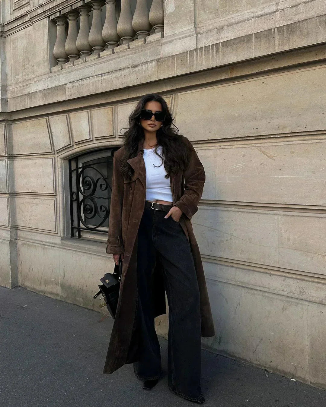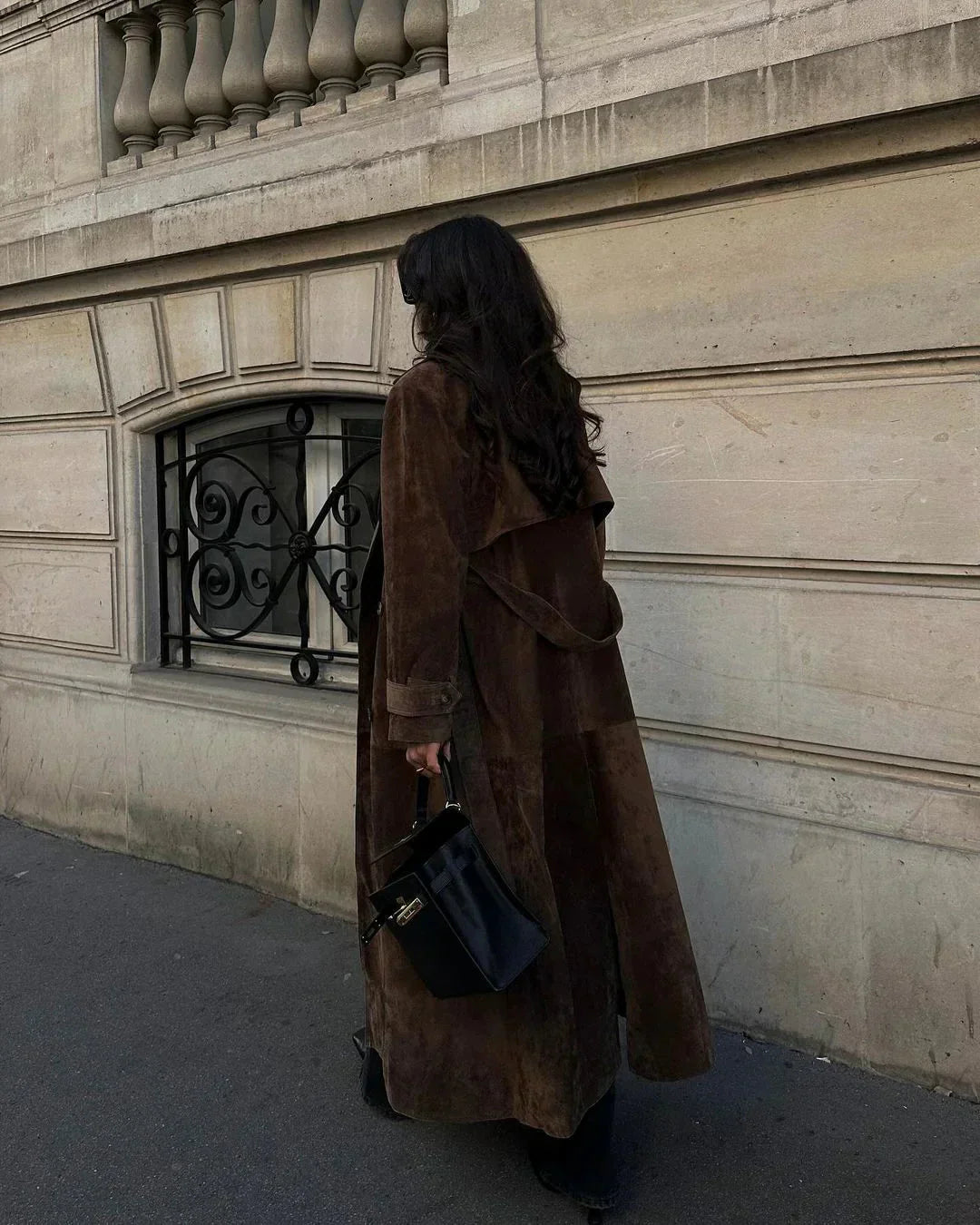 Dam Kappa Dubbelradig Suedette Med Stormflik och Läderbälte
