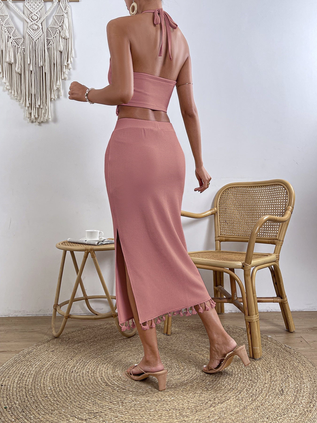 Upplev en lekfull stil med detta klädeset som kombinerar elegans och komfort. Den livliga rosa färgen och de charmiga fransarna ger en unik touch som lyfter din garderob.