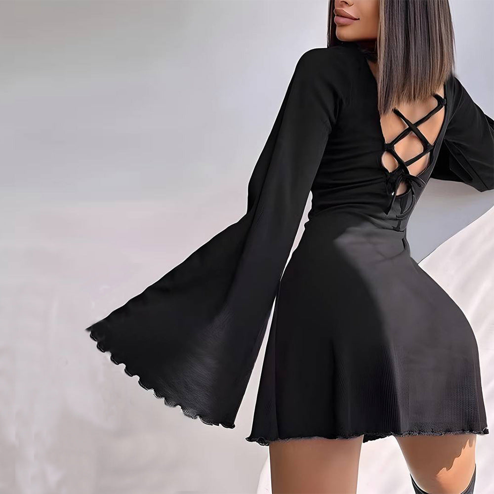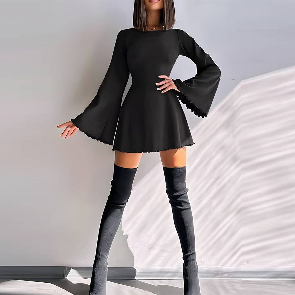 Denna klänning har en hög midja och långa ärmar, vilket ger en tidlös look. Den monokroma designen gör den lätt att styla och passar utmärkt för olika tillfällen, från kontoret till en kväll ute.