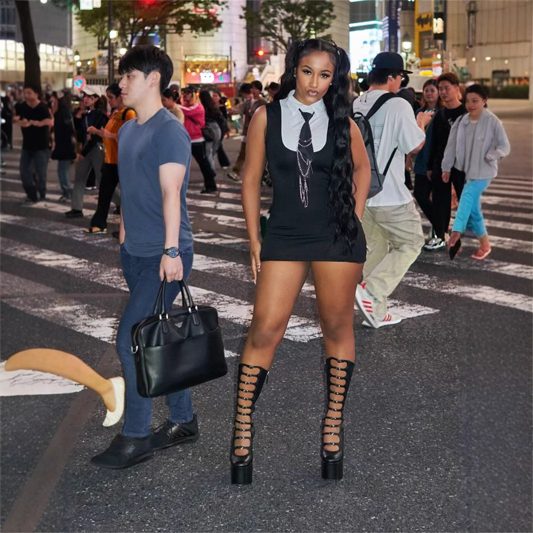 Dam Klänning Kort Ärmlös Polyester Spandex med Kontrastfärg