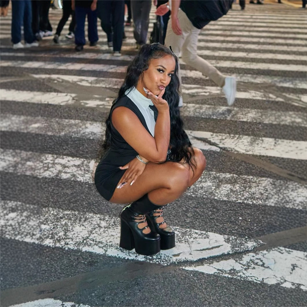 Denna klänning kombinerar en trendig kontrastfärg med en bekväm passform, vilket gör den idealisk för både vardag och fest. Med sin korta längd och rund halsringning är den både chic och lätt att styla.