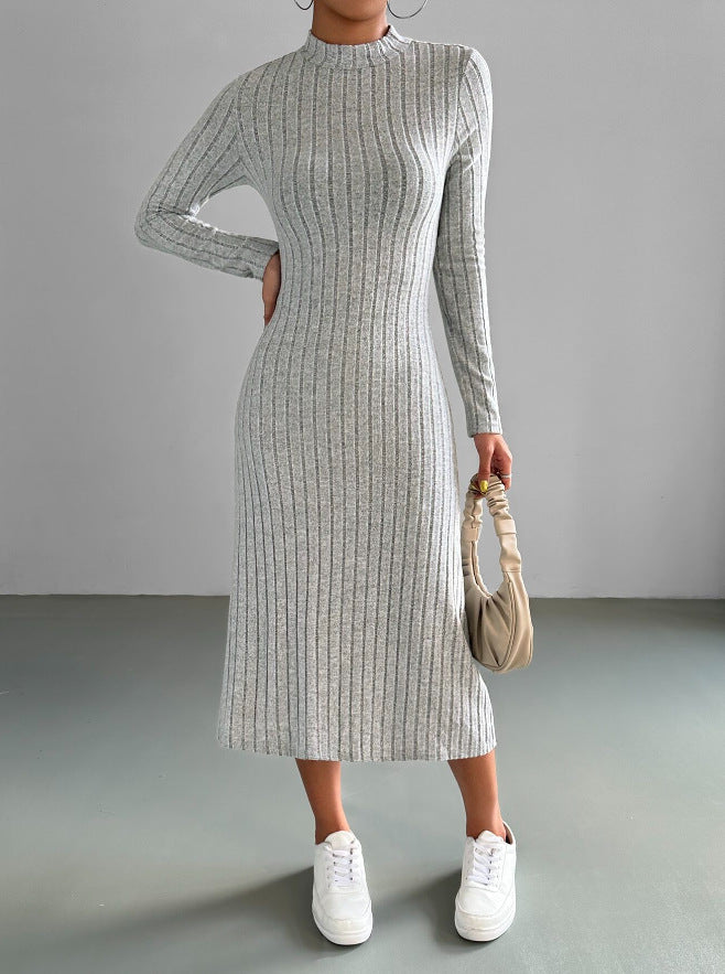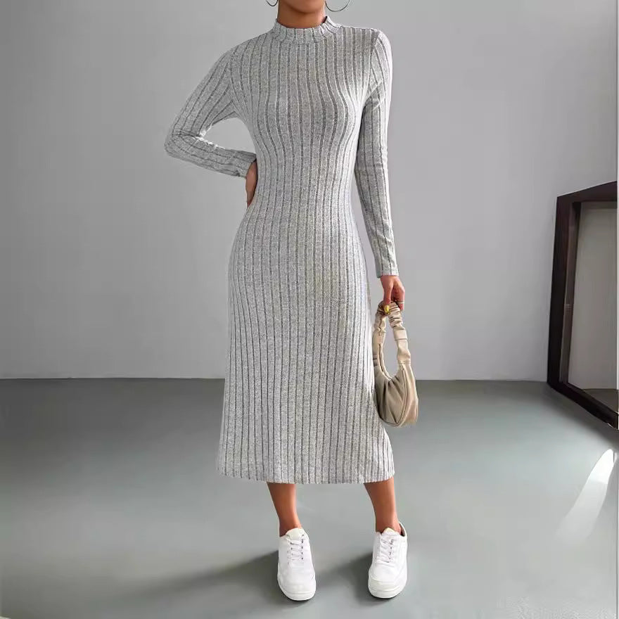 Denna klänning har en elegant ribbad design och en halvmockad krage som ger en modern touch. Med sin midi-längd och långärmade stil är den idealisk för svala dagar och kvällar.