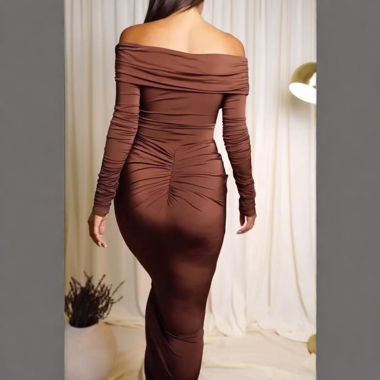 Denna klänning kombinerar en modern design med en klassisk silhuett, vilket gör den idealisk för både festliga och avslappnade tillfällen. Med sina långa ärmar och off-shoulder detalj ger den en unik och trendig look.