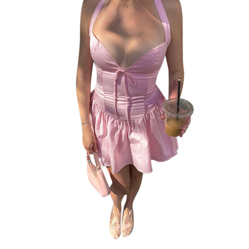 Klänningen har en smickrande V-ringning och justerbara axelband för en perfekt passform. Den voluminösa kjolen ger en svävande känsla och rörelsefrihet, vilket gör den idealisk för både fester och avslappnade tillfällen.