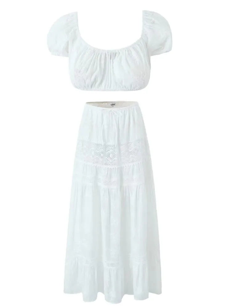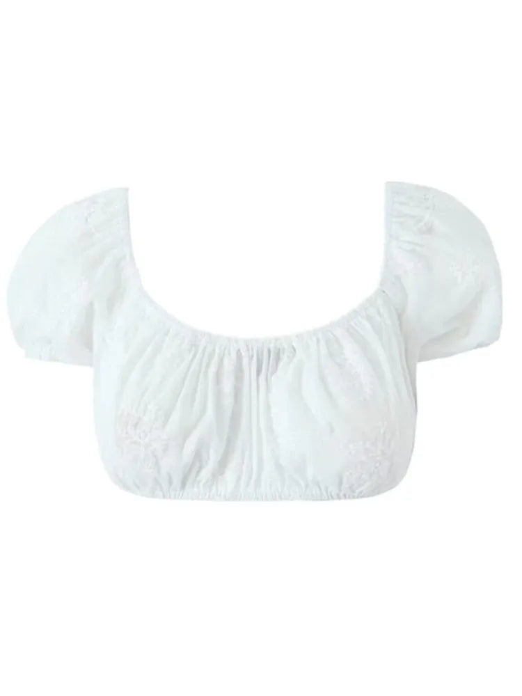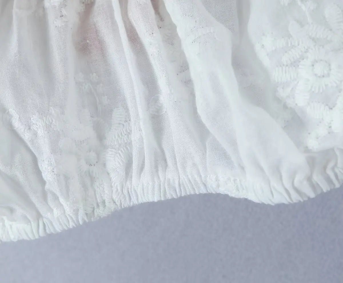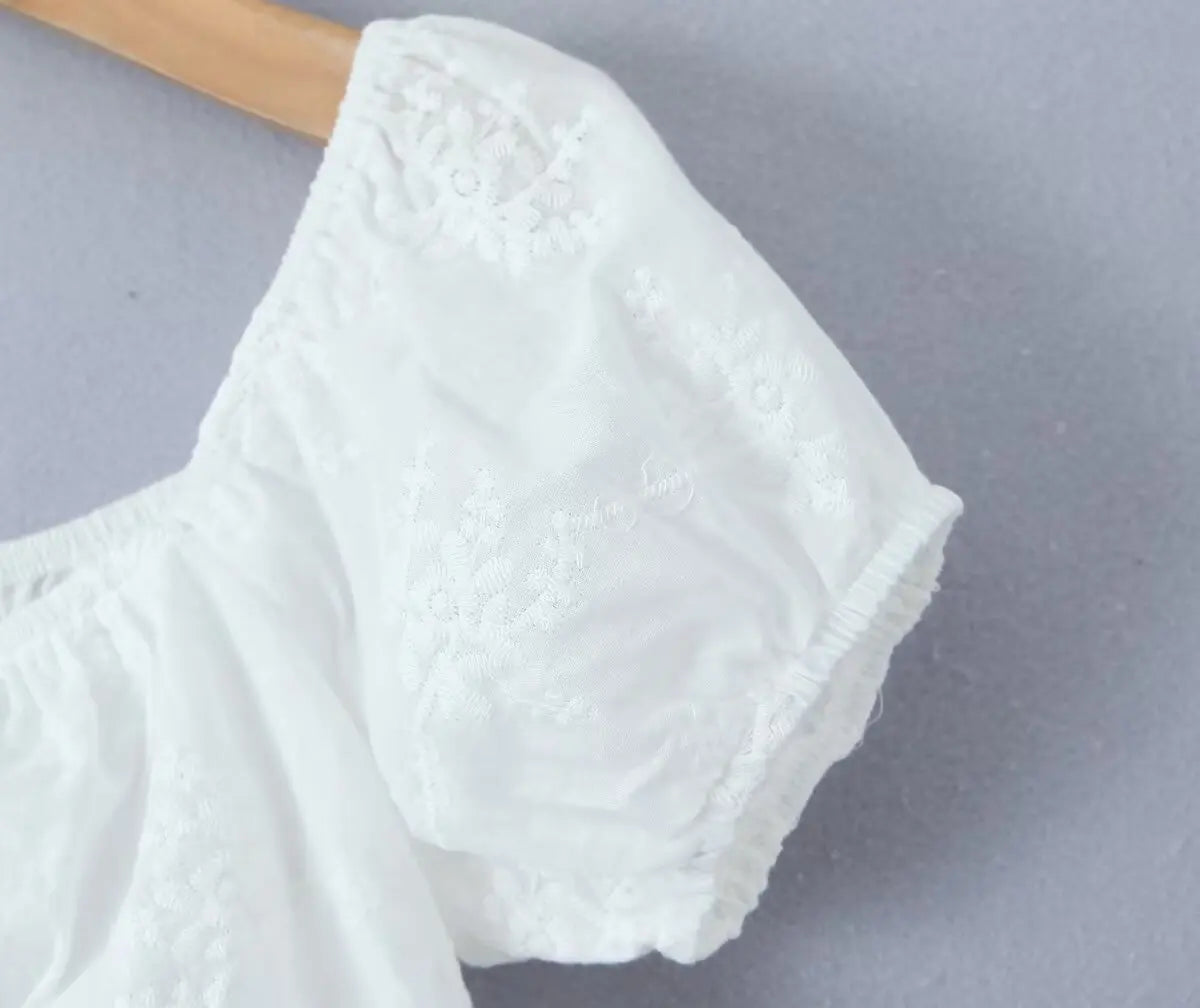 Rockens bakre snitt och puffärmar ger en modern touch, medan de konstnärliga detaljerna framhäver en feminin stil. Den är idealisk för både vardag och fest, vilket gör den till ett mångsidigt plagg i din garderob.