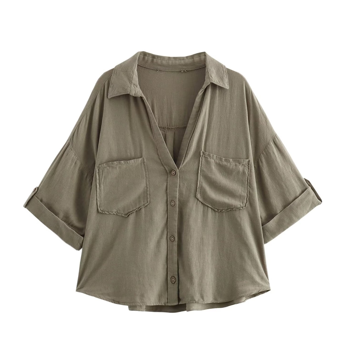 Dam Kort Skjorta Med Dubbelfickor i Högkvalitativ Bomull