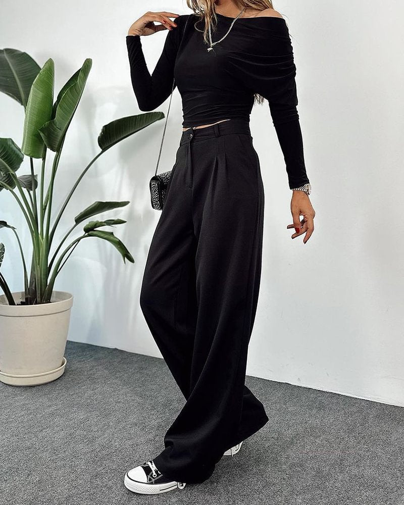 Byxorna har en klassisk silhuett med breda ben som ger en modern touch. De är perfekta för formella tillfällen eller en avslappnad dag på stan, och kan enkelt stylas för att passa olika tillfällen.