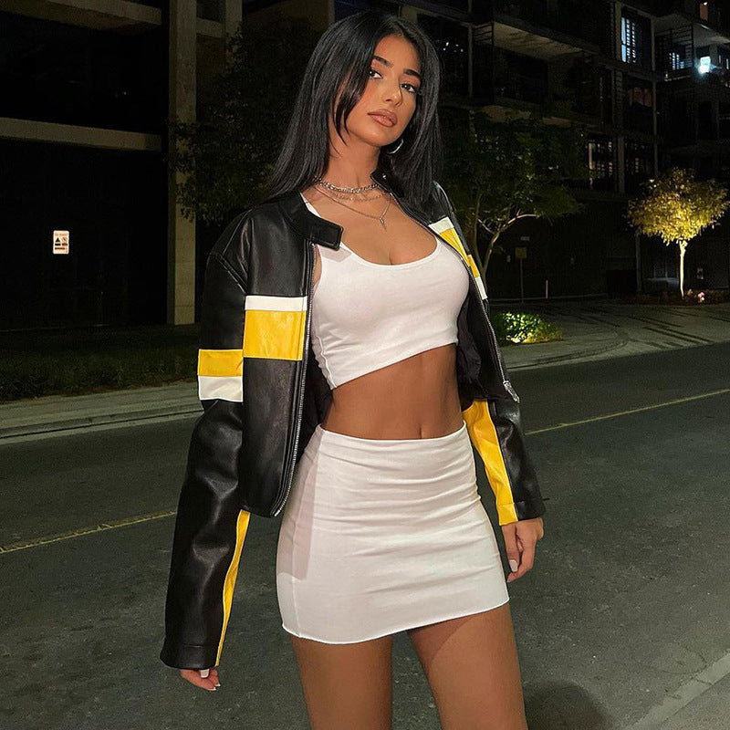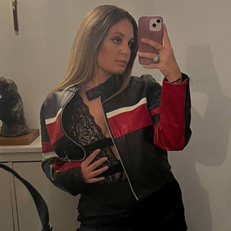 Denna jacka har en unik design med färgblock i svart, rött och vitt, vilket ger en modern twist på den klassiska cykliststilen. Dragkedjan är både praktisk och en del av jackans distinkta utseende, vilket gör den till ett utmärkt val för både vardag och fest.