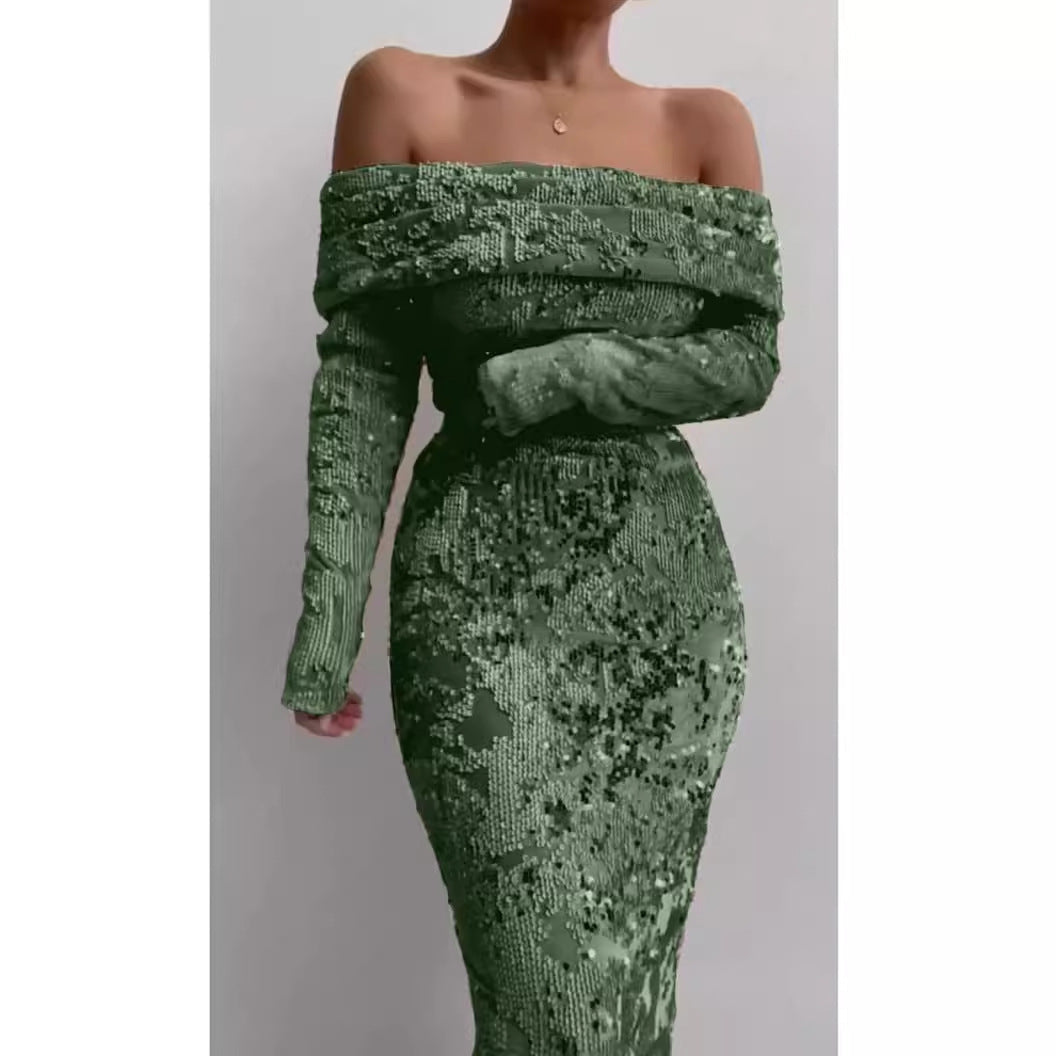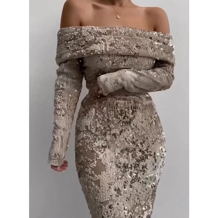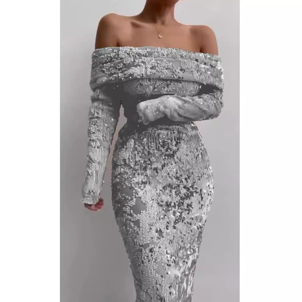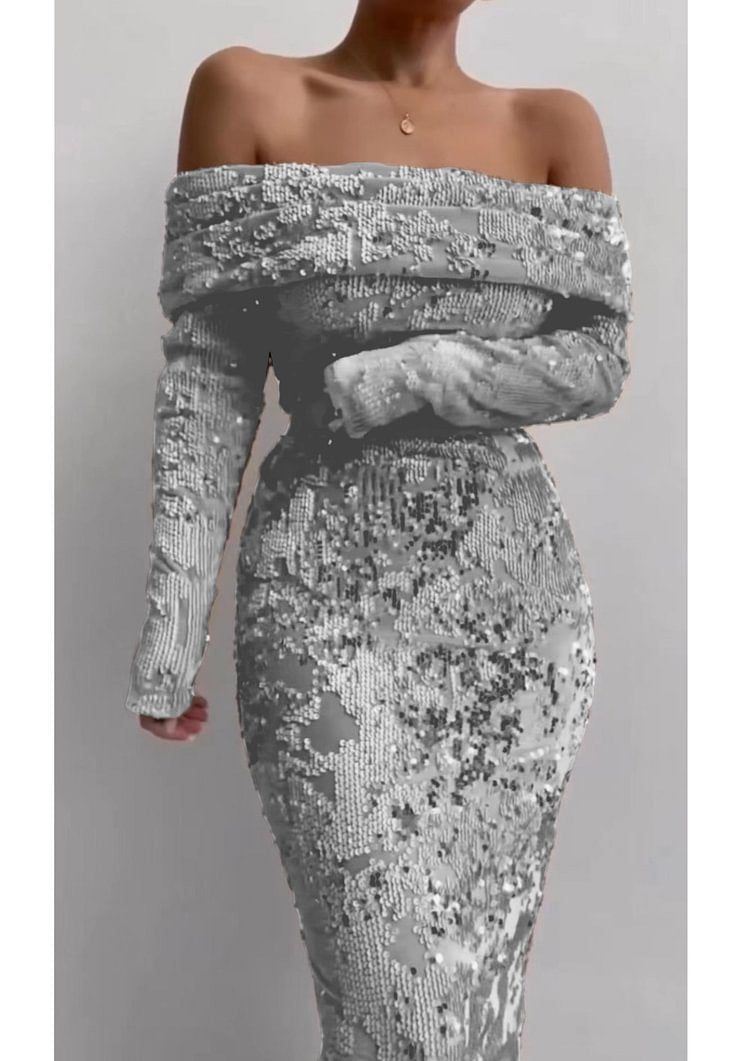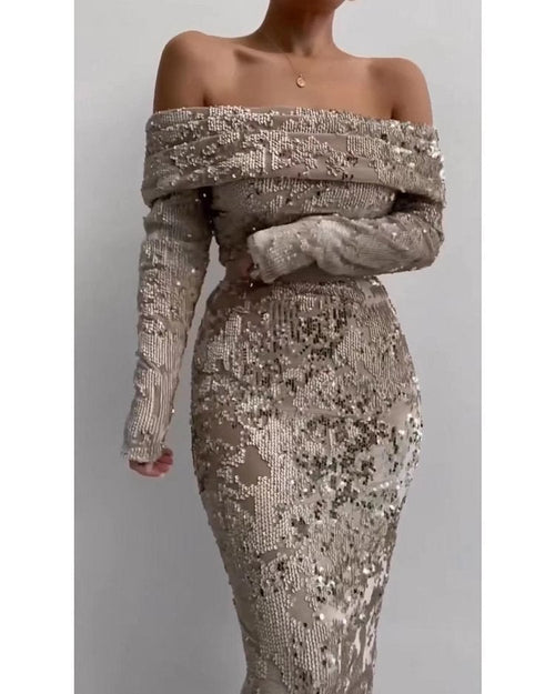 Denna fantastiska festklänning med paljetter och guldfolie kommer att få dig att känna dig som stjärnan på varje tillställning. Med sin eleganta design och glittrande detaljer är den perfekt för att skapa oförglömliga minnen.