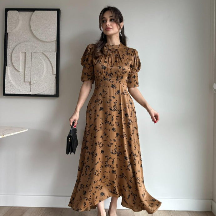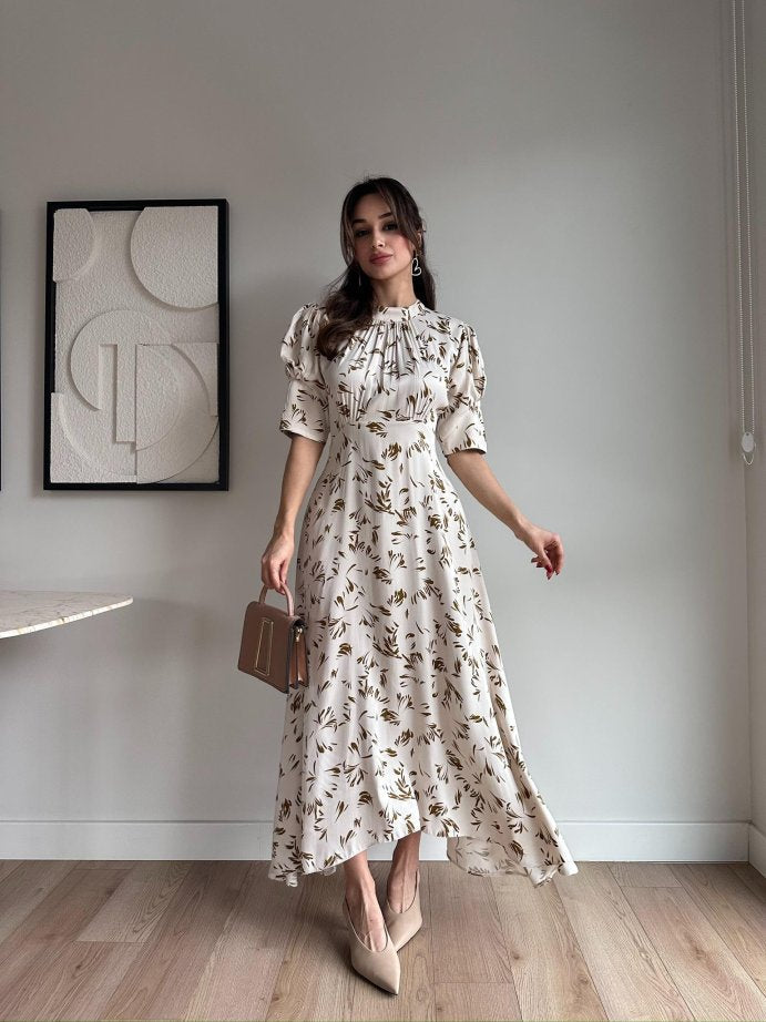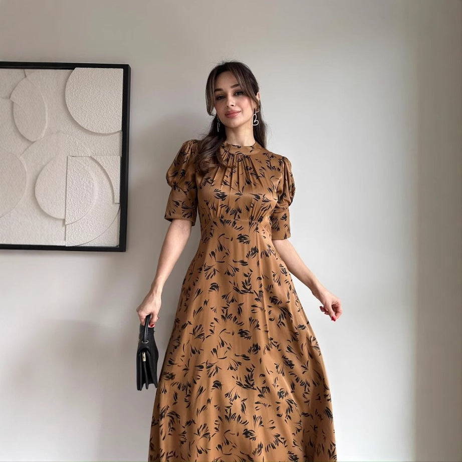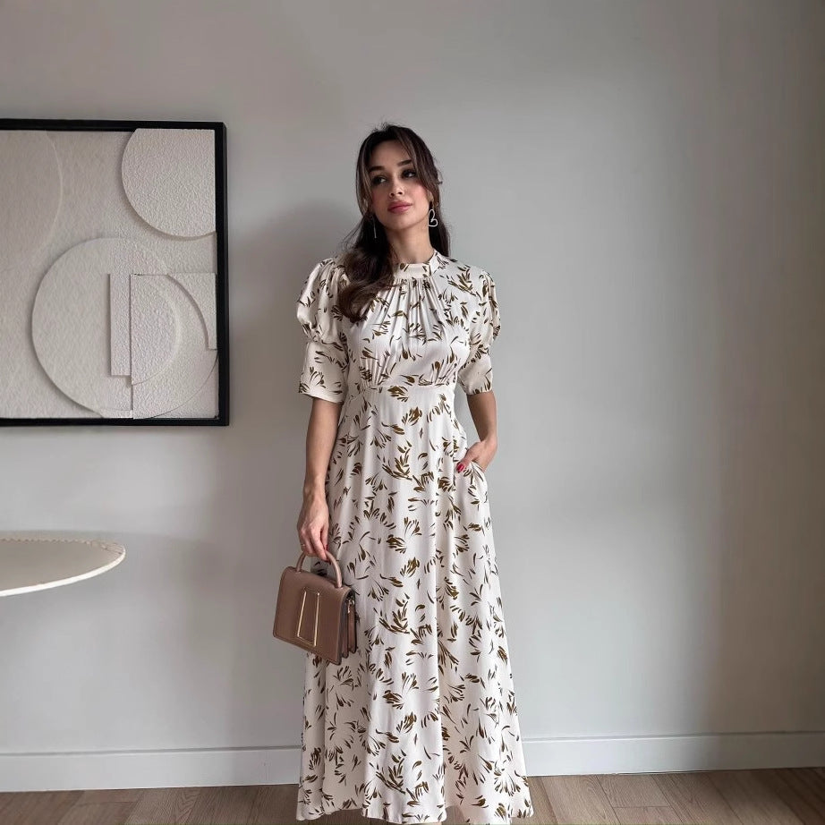 Den blommiga designen och den högmidjade silhuetten ger en feminin touch, medan den halva öppna kragen och de reguljära ärmarna bidrar till en modern look. Klänningen är tillverkad av mjuk polyester, vilket gör den bekväm att bära hela dagen.