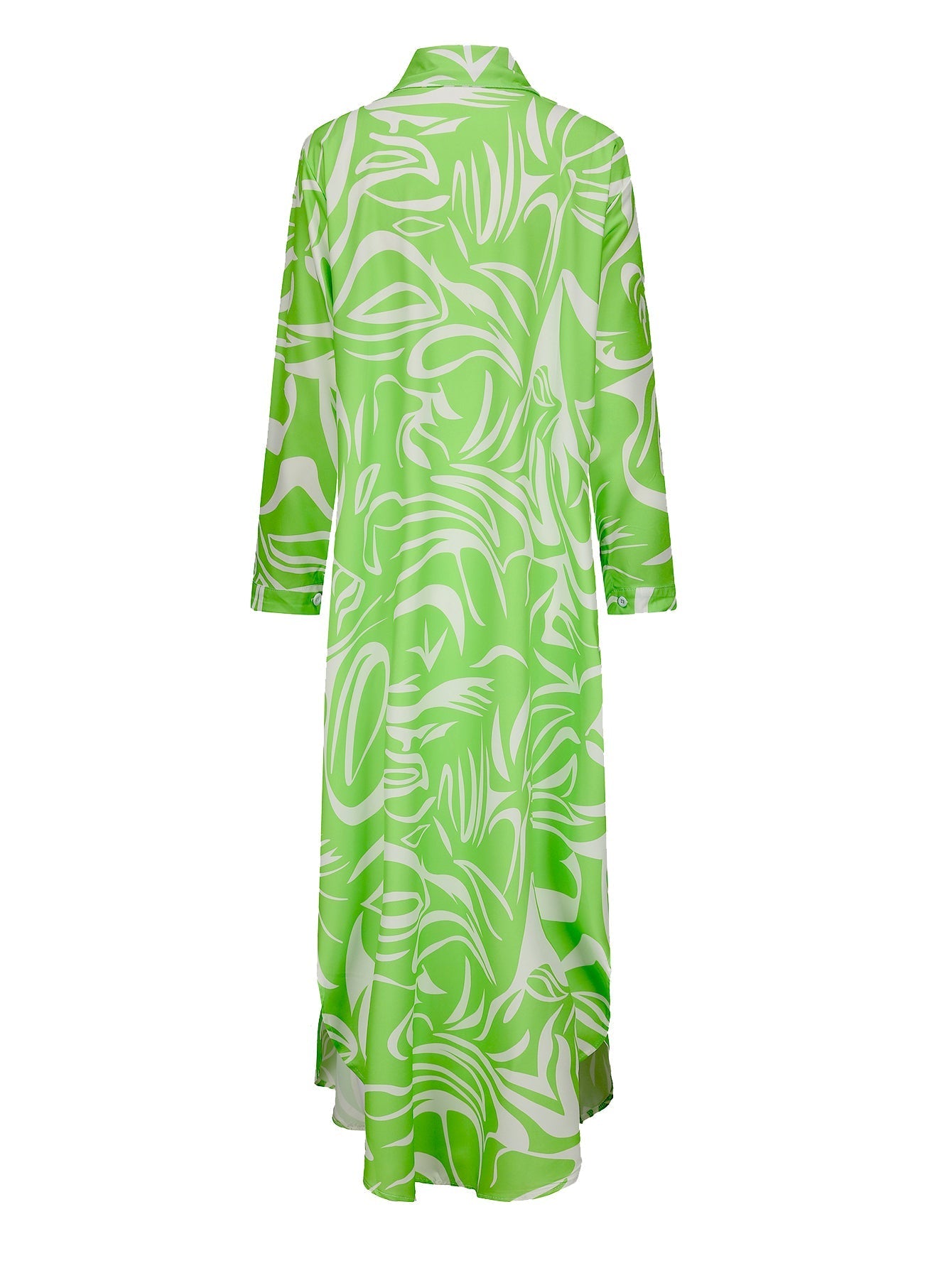 Denna skjortklänning har en elegant design med en knapphalsring och en klassisk krage. Den mintgrönvita färgen ger en fräsch och modern look, vilket gör den till ett utmärkt val för vår- och sommarsäsongen.