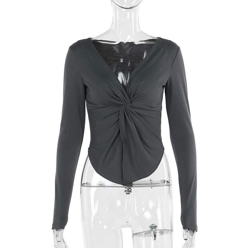Dam Långärmad Topp Wrap Design Elastisk V-halsning