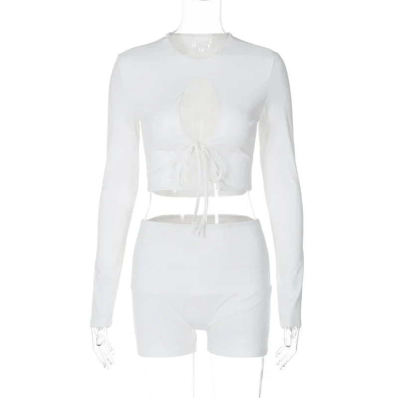 Setet består av en beskuren topp med långa ärmar och medelstora byxor med elastiskt midjeband, vilket gör det både bekvämt och stiligt. Den moderna designen gör att du kan använda det vid olika tillfällen, från hemmakvällar till avslappnade träffar med vänner.