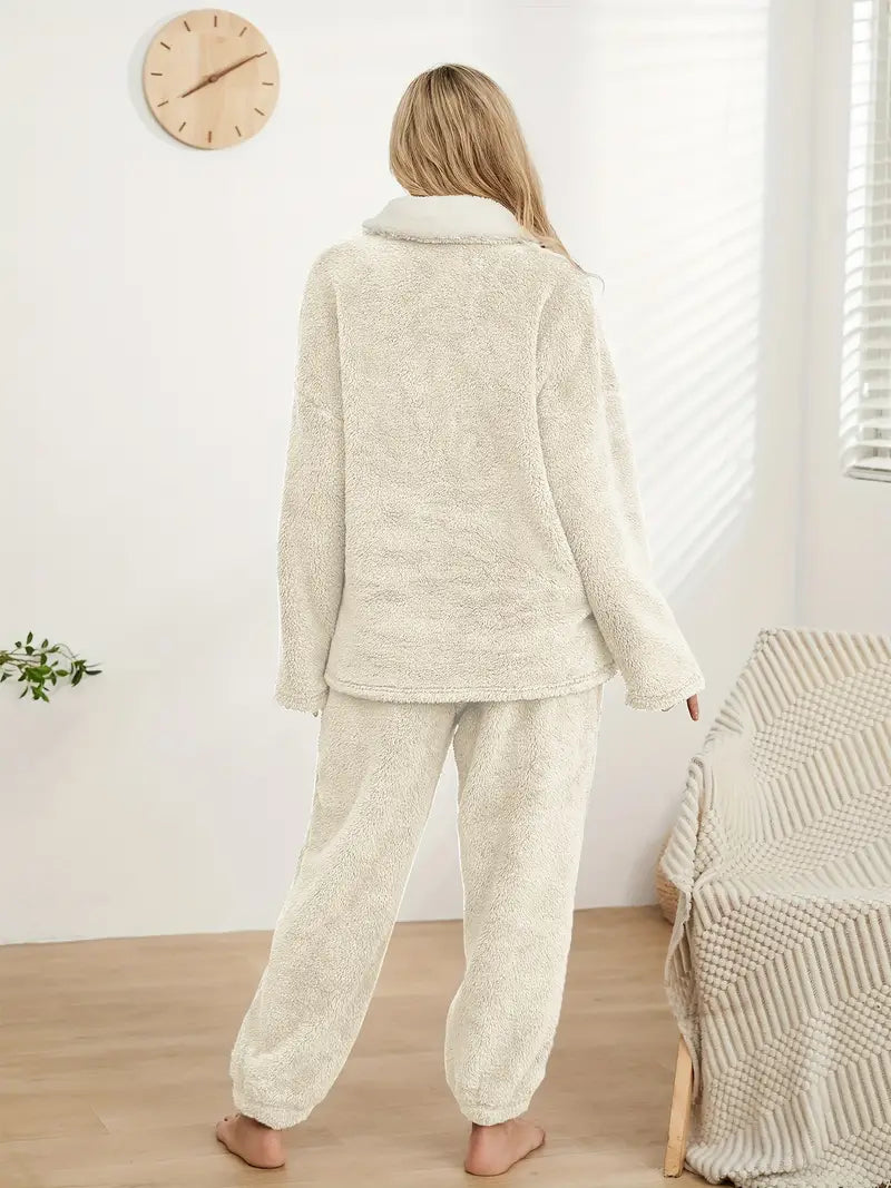 Detta eleganta set består av en långärmad V-ringad topp och avslappnade byxor, vilket gör det till ett utmärkt val för kalla kvällar. Den mjuka flanellen ger en lyxig känsla och kombinerar stil med funktionalitet.