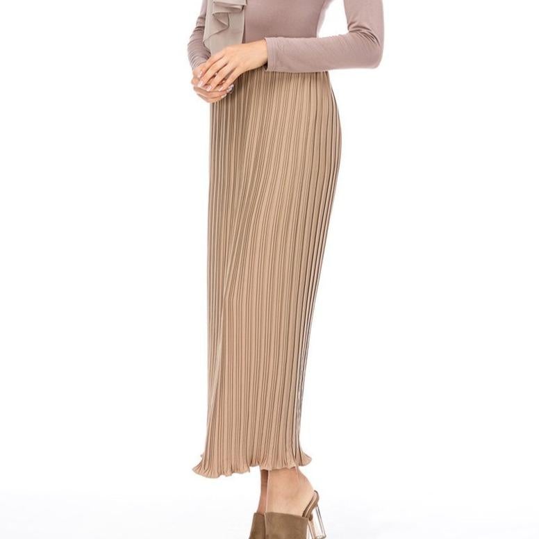 Den veckade designen ger en unik och modern look, medan den elastiska midjan säkerställer en bekväm passform. Denna maxirock är idealisk för varma dagar eller som ett lager under kyligare kvällar.