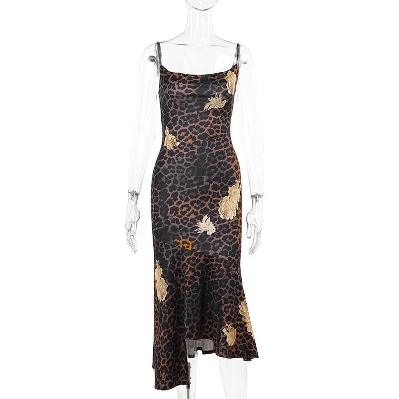 Klänningen har ett unikt leopardmönster som ger en djärv look, medan de känsliga blomma accenterna tillför en romantisk känsla. Den är idealisk för både speciella tillfällen och en kväll ute i staden.