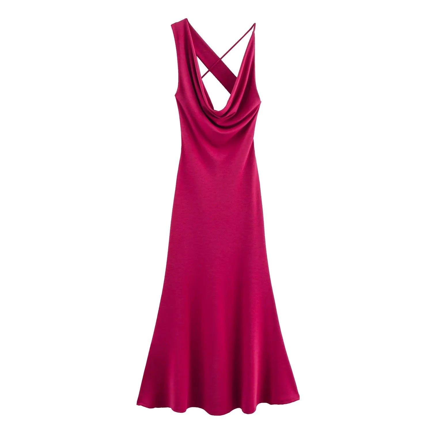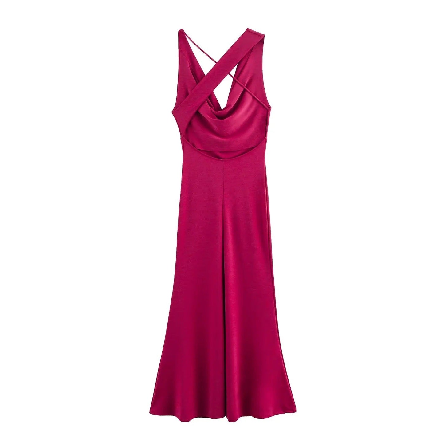 Klänningen har ett unikt snitt som framhäver midjan och skapar en smickrande silhuett. Den djupare halsringningen ger en modern touch, medan de smala, korsade bärarna erbjuder både stil och rörelsefrihet. Perfekt för bröllop, kvällsevenemang eller festliga tillfällen, denna klänning kan enkelt stylas med olika accessoarer för att passa din personliga stil.