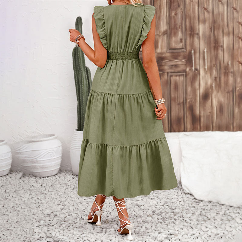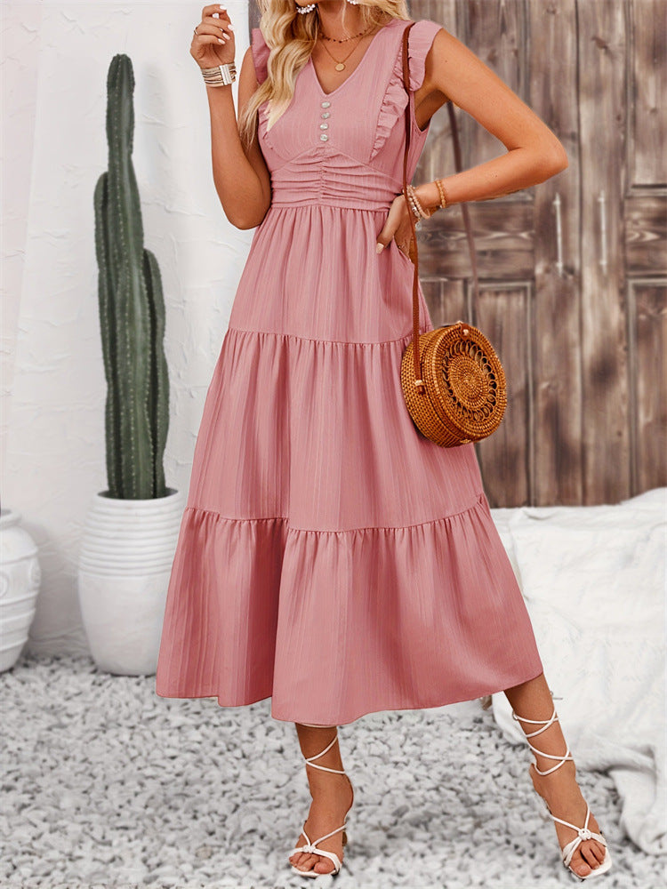 Klänningen har en flödande midillängd och är prydd med rüsch-detaljer på ärmarna, vilket ger en feminin och stilren look. Den dekorativa knappremsan tillför en extra touch av elegans, vilket gör den idealisk för både avslappnade och mer formella sammanhang.