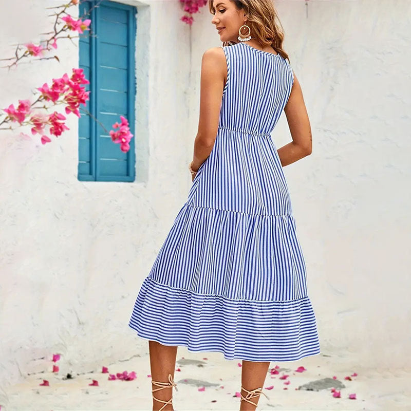 Upplev en perfekt kombination av stil och komfort med vår MIDI-klänning. Den unika randiga designen och de delikata volangerna gör att du känner dig både elegant och avslappnad under varma sommardagar.