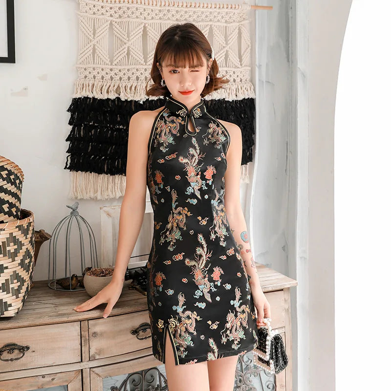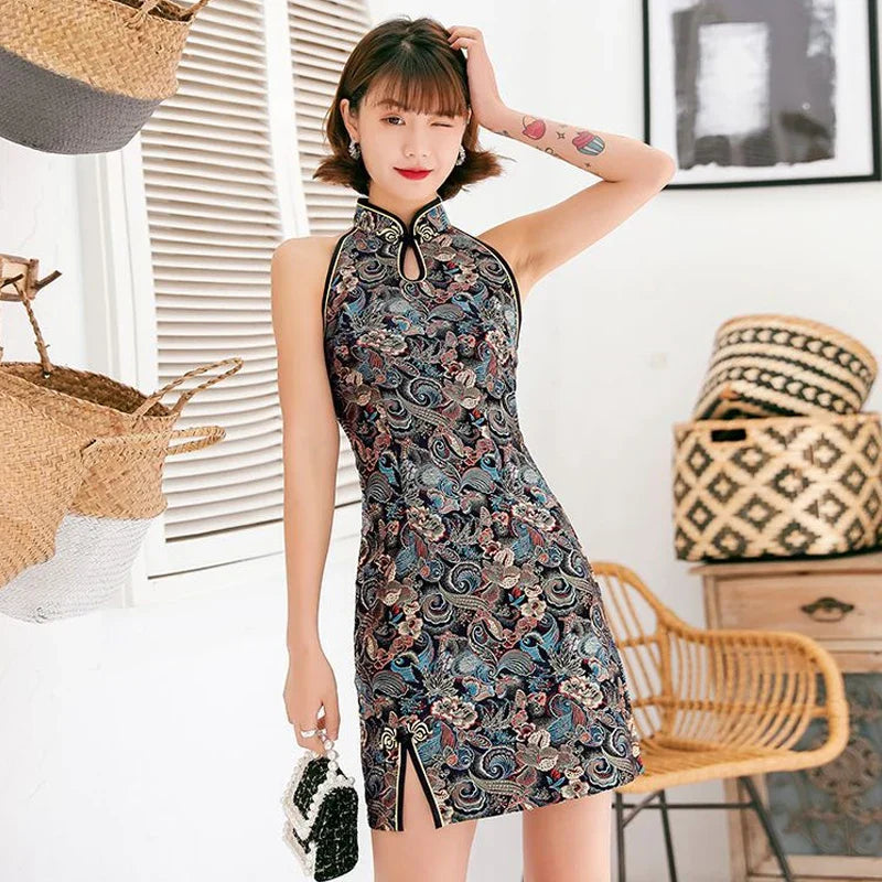 Dam Miniklänning Blommönster Satin Ärmlös Elegant