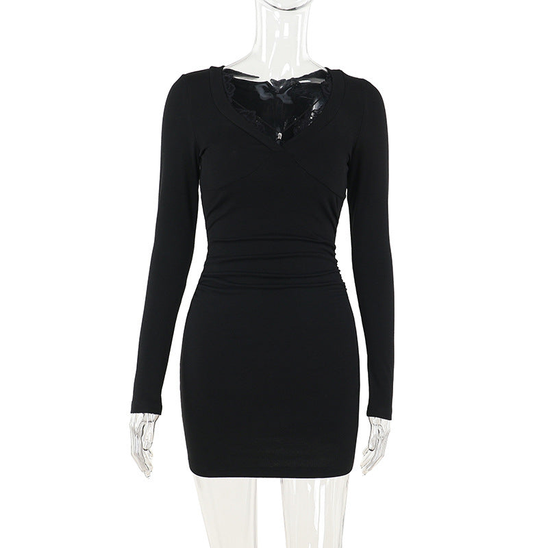 Denna klänning är designad med en figurnära silhuett som smickrar dina kurvor. Den eleganta V-ringningen ger en förförisk touch, medan de långa ärmarna tillför en känsla av elegans. Klänningen är mångsidig och kan enkelt kombineras med både högklackade skor och avslappnade sneakers, vilket gör den idealisk för dejter, festliga evenemang eller en kväll ute.