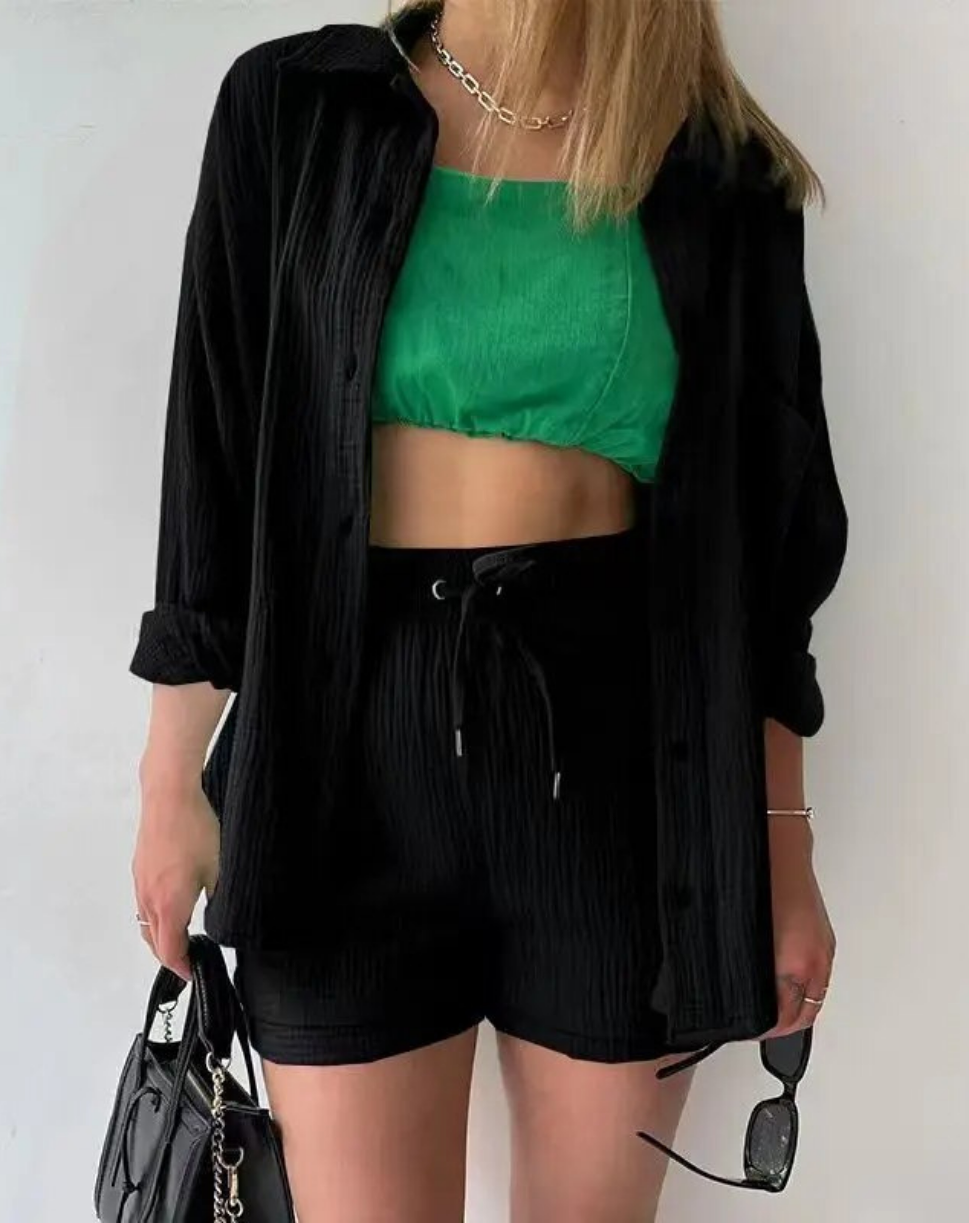 Setet inkluderar en topp med en elegant krage och kontrasterande ärmar, samt lämpliga shorts som är idealiska för varma nätter. Det lätta och andningsbara materialet gör att du kan känna dig sval och bekväm hela natten.