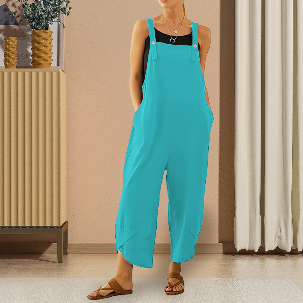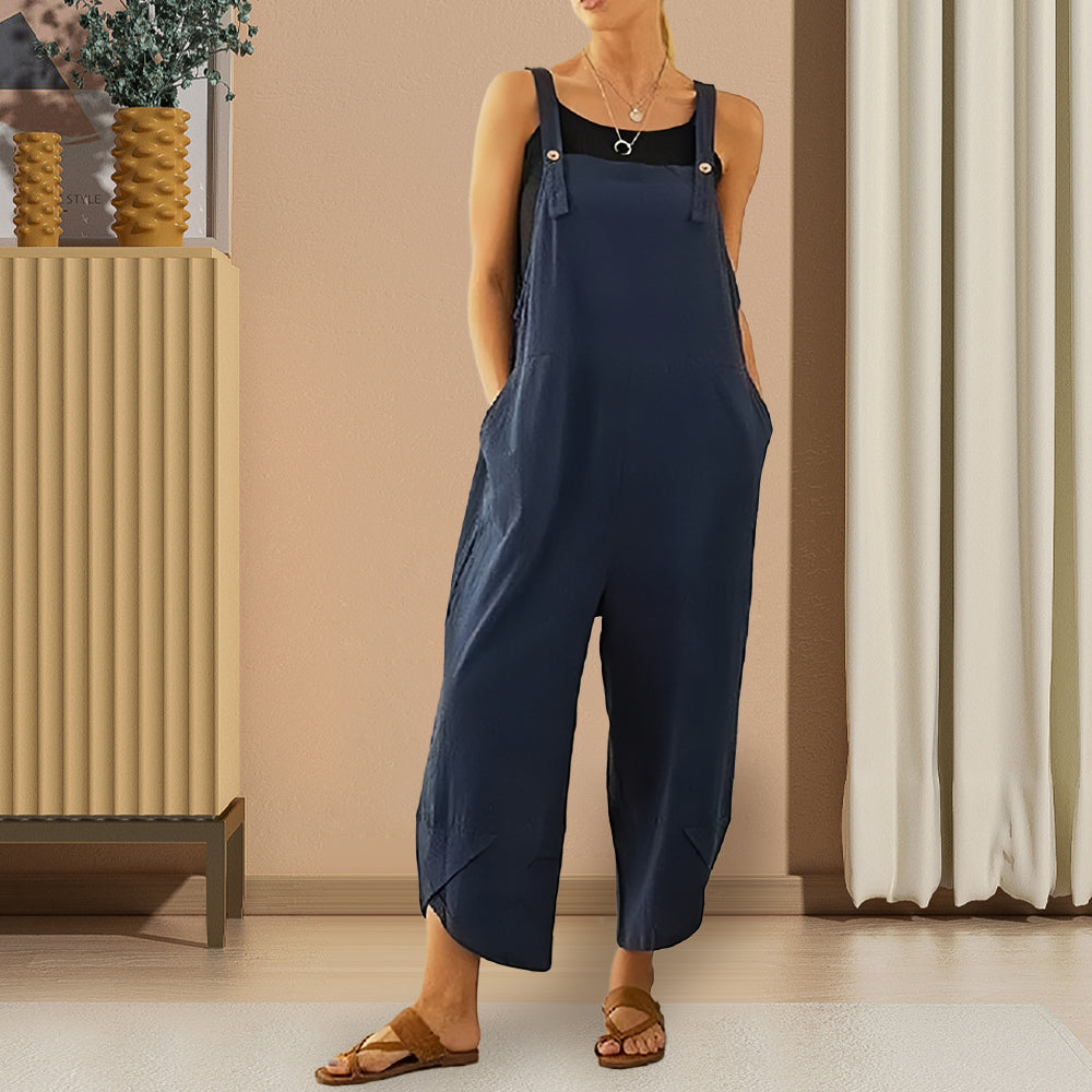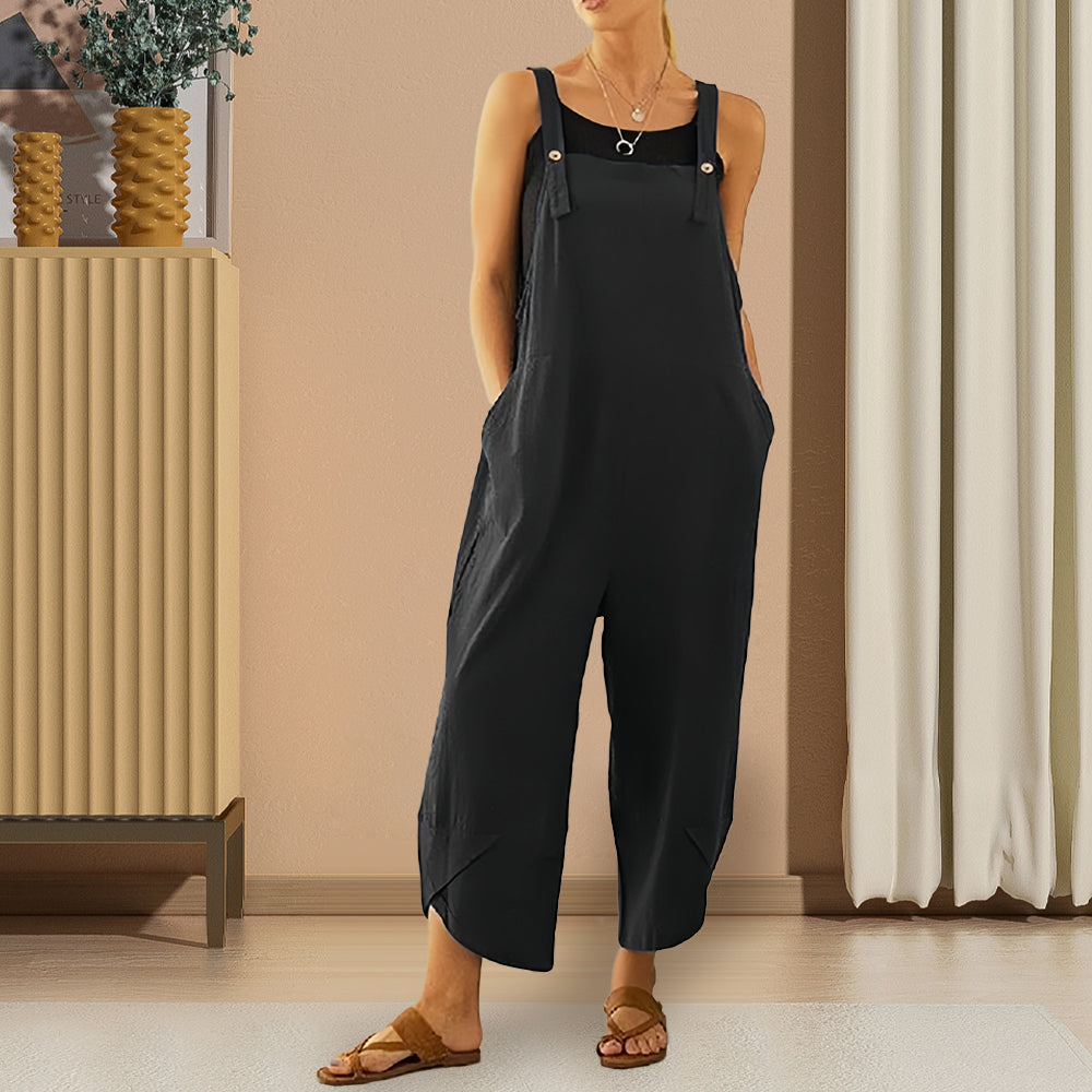 Denna overall har en minimalistisk och andningsbar design som gör den idealisk för alla tillfällen. Med sin klassiska U-hals och lösa passform erbjuder den både elegans och rörelsefrihet, vilket gör att du alltid känner dig bekväm och stilfull.