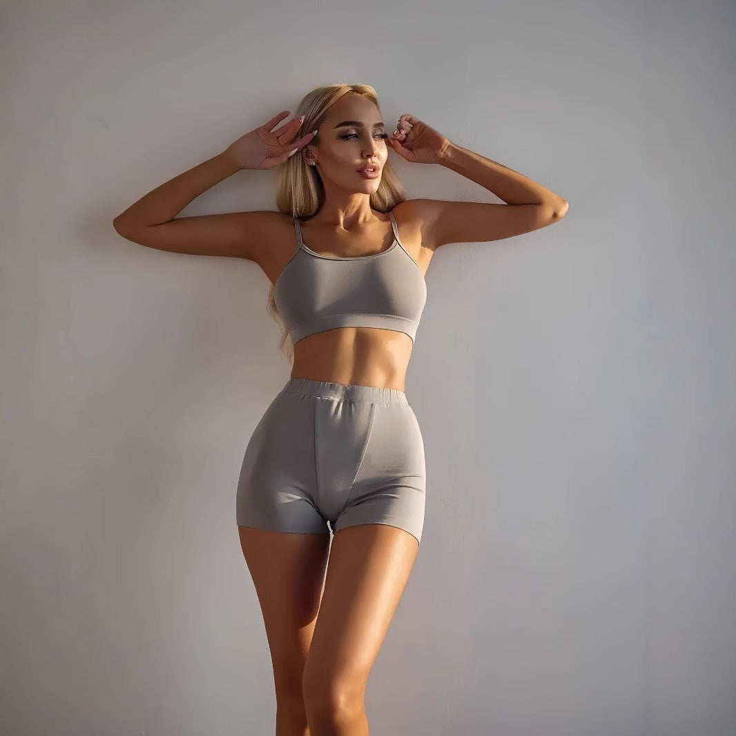 Detta set har en fräsch och söt design med ärmlös topp och capribyxor, vilket gör det idealiskt för både hemmabruk och träning. Den stiliga looken gör att du kan bära det vid olika tillfällen.