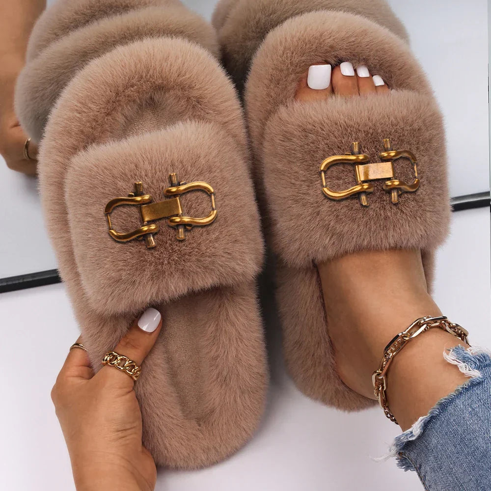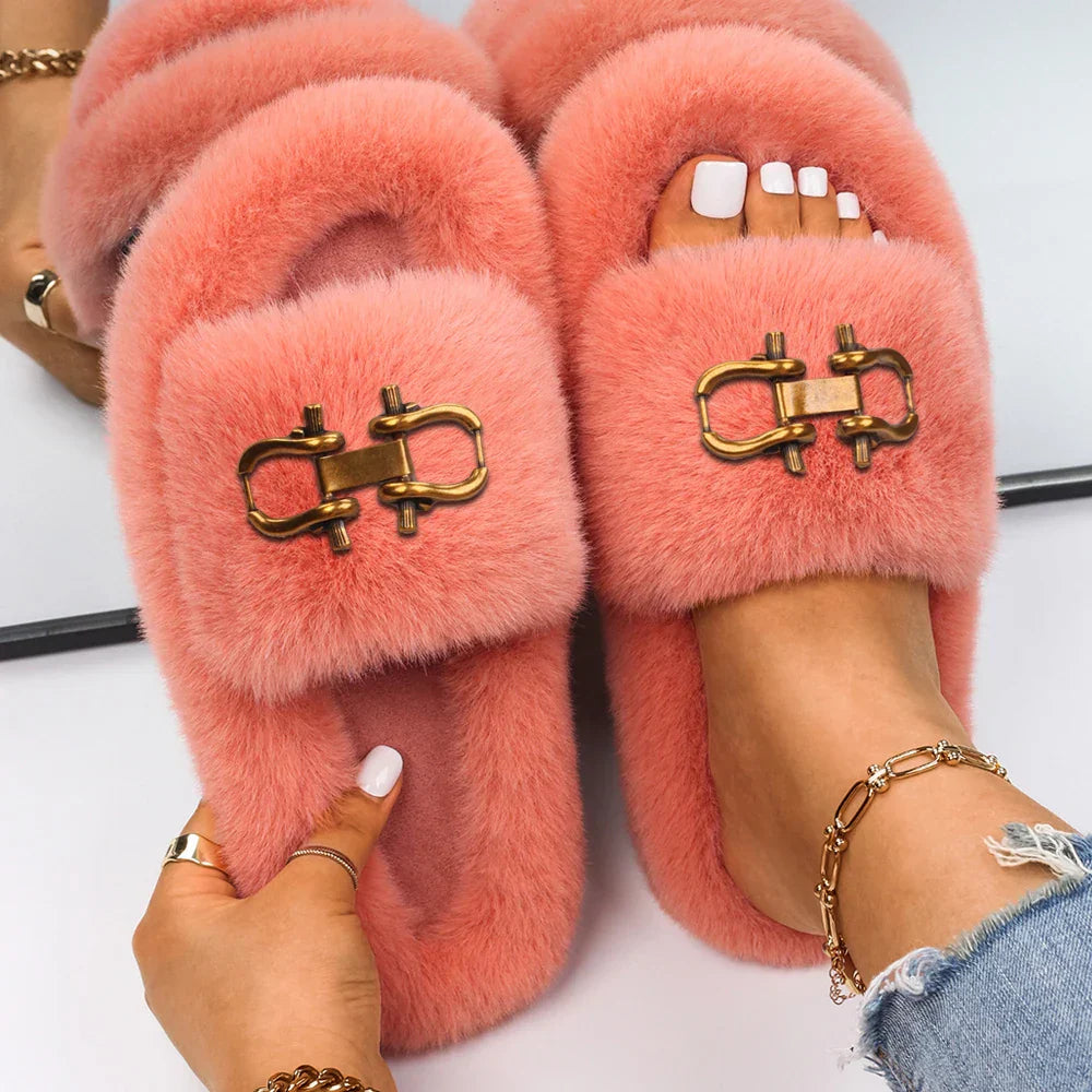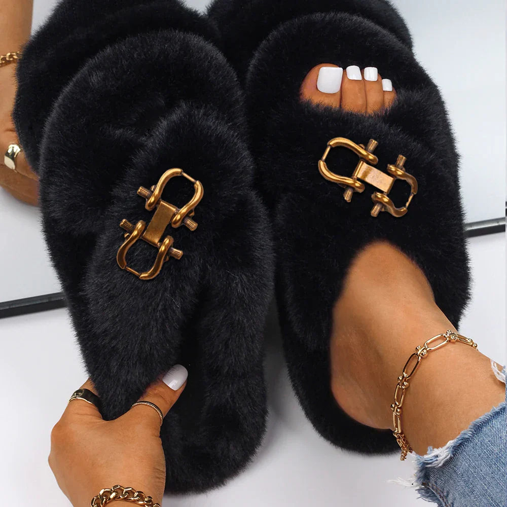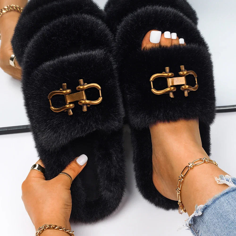 Dam Sandaler Platta Syntetisk Päls med Metalliska Accenter