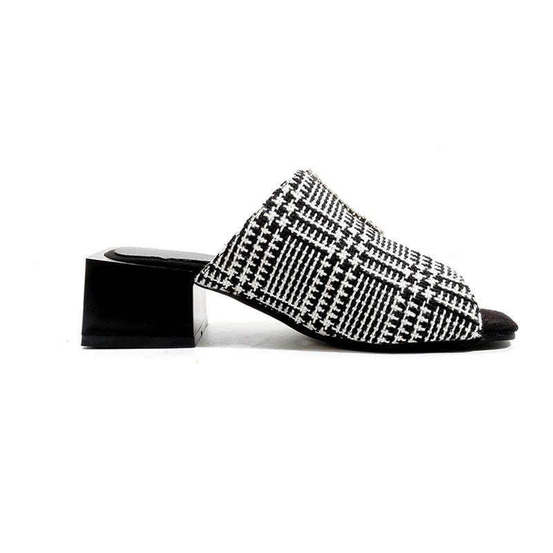 Dessa sandaler har ett modernt rutigt mönster och är designade för att passa både avslappnade och mer uppklädda tillfällen. Med en medelhög klack och en bekväm passform är de idealiska för en dag på stan eller en sommarfest.