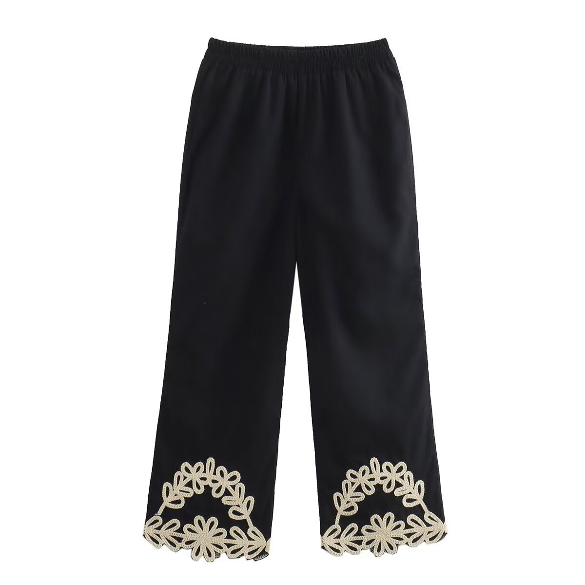 Dam Set Broderad V-ringning Långbyxor Högkvalitativt Tyg