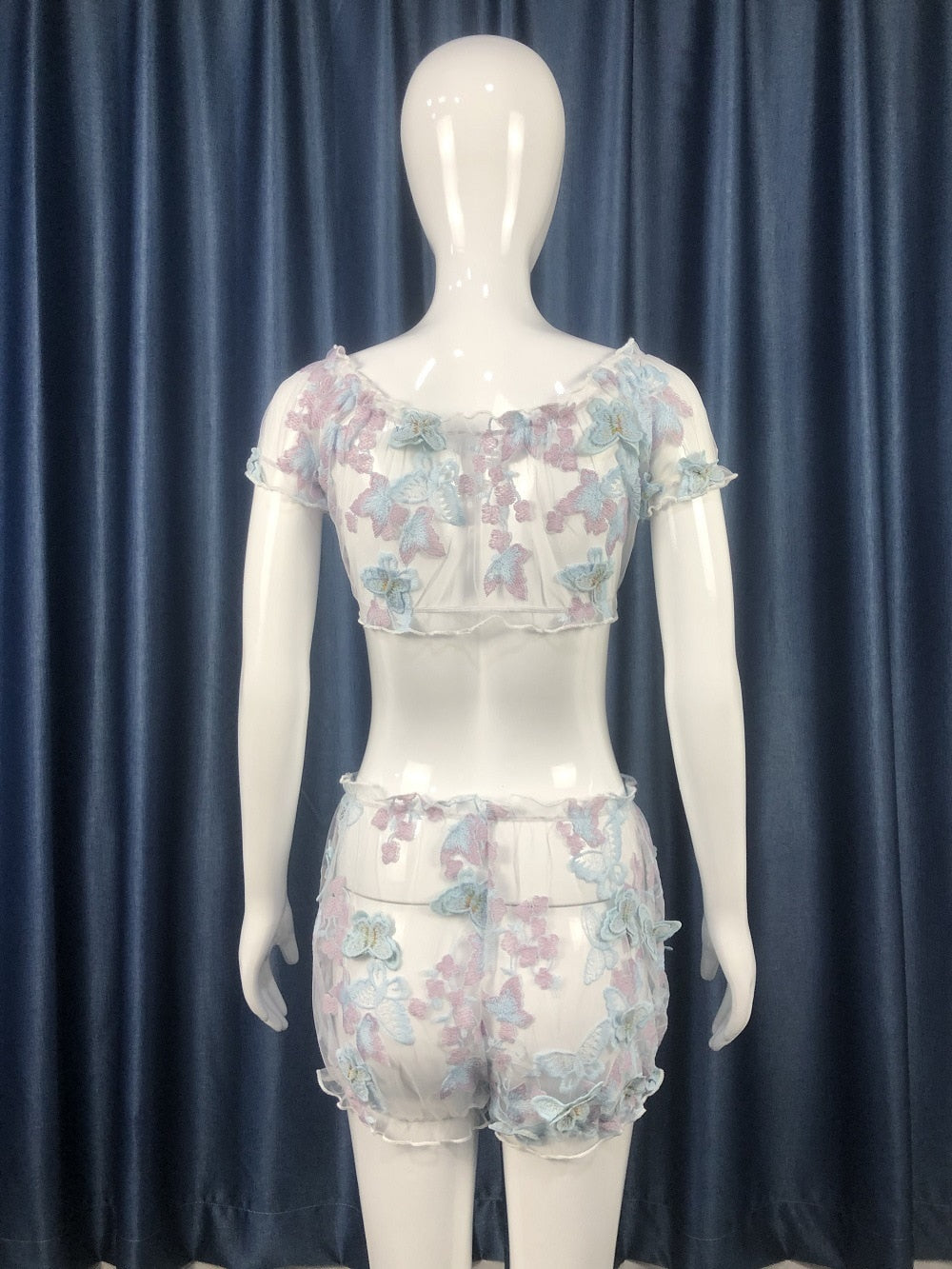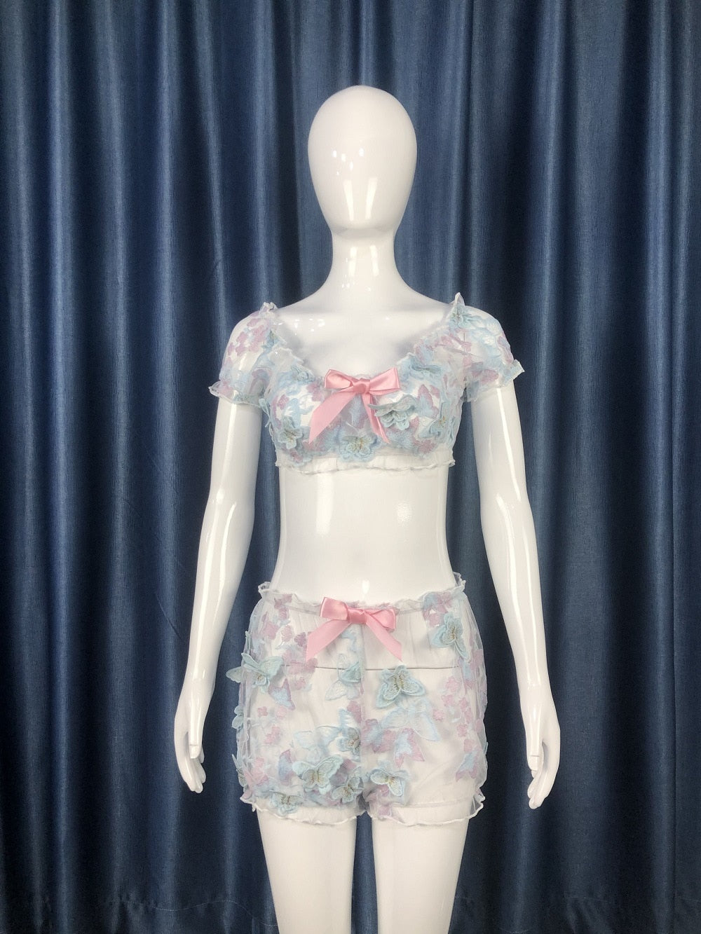 Dam Shorts Set med Fjärilsmönster Syntetfiber Elastiskt Midjeband-1