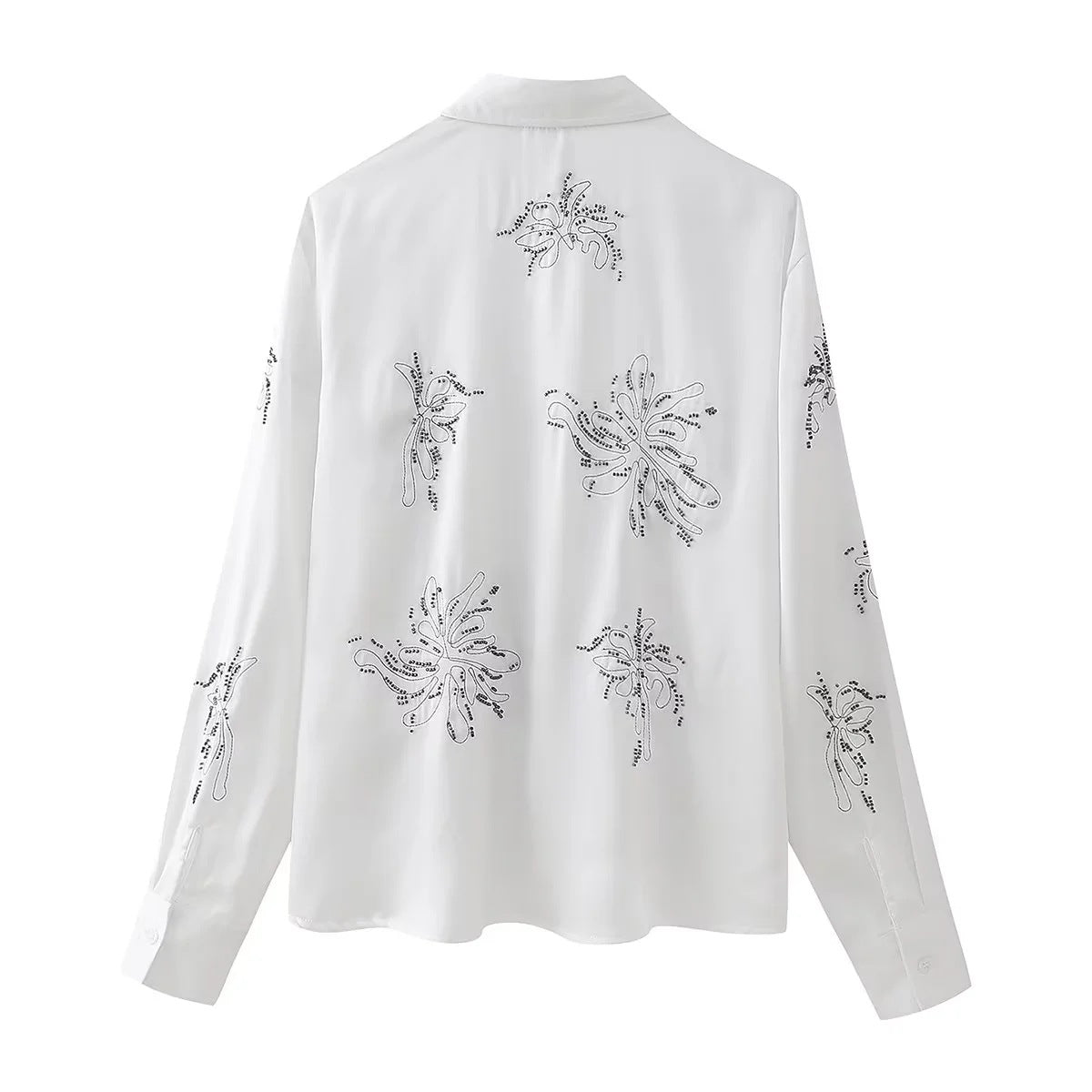 Skjortan har ett unikt blommönster och är designad för att ge en modern känsla. Med sina långa ärmar och paljetter blir den ett utmärkt val för både vardag och fest.