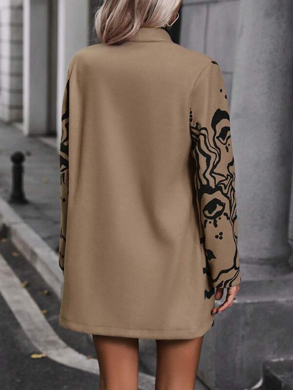 Denna skjorta har ett modernt snitt som framhäver en elegant silhuett. De långa ärmarna och det stora trycket i djupa kaffetoner ger en unik touch, vilket gör den idealisk för kontoret, avslappnade utomhusaktiviteter eller tid med vänner.