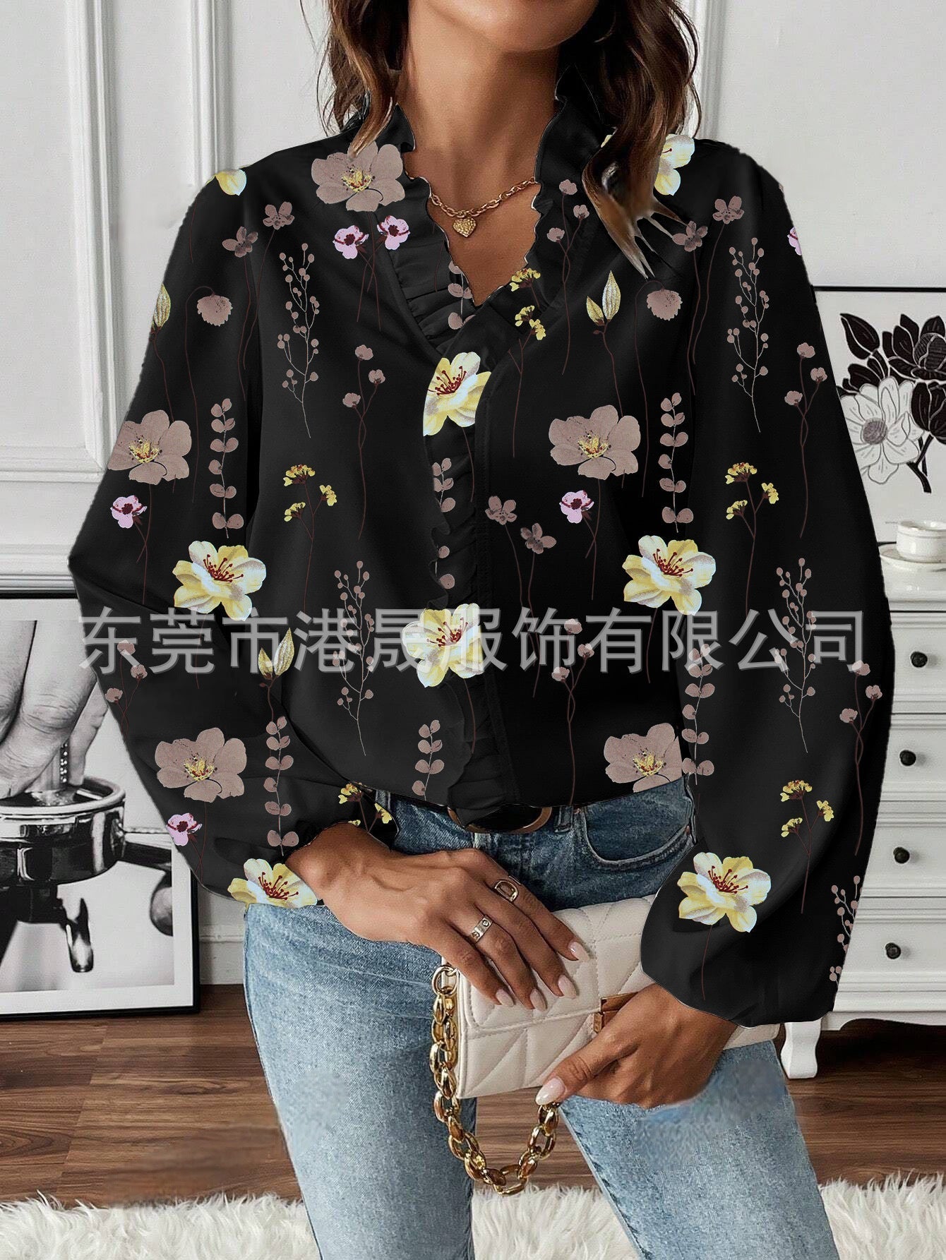 Dam Skjorta Långärmad V-Hals Volang Lätt Väv