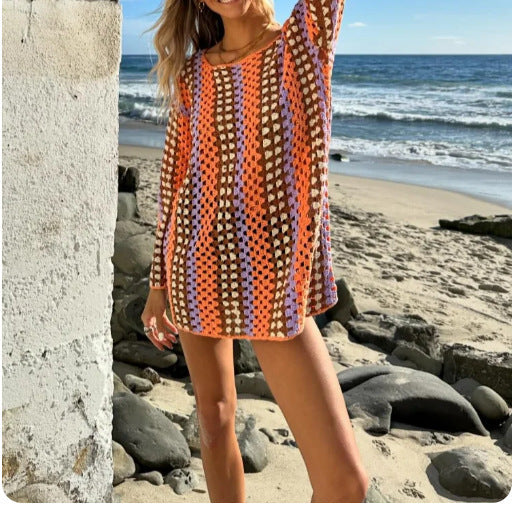 Skjortan har ett unikt, öppet virkningsmönster och ett feminint snitt som gör den perfekt för avslappnade tillfällen. Den är mångsidig nog att bäras över en bikini eller shorts för stranden, eller som en stilfull överläggning för en dag i parken.