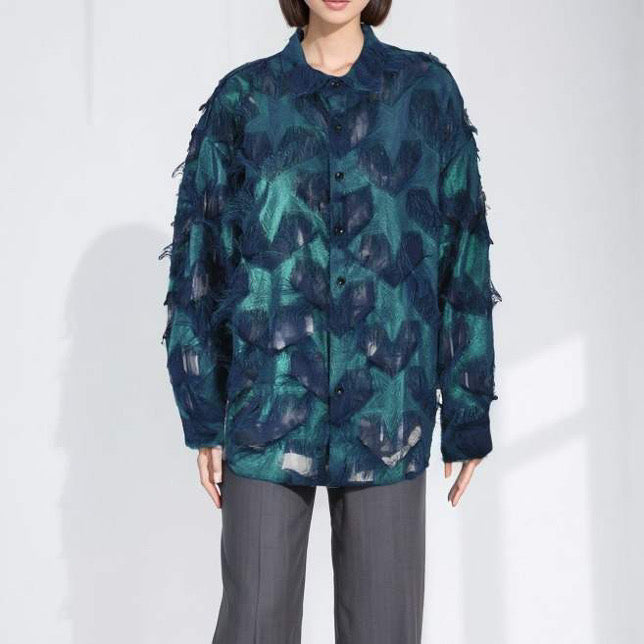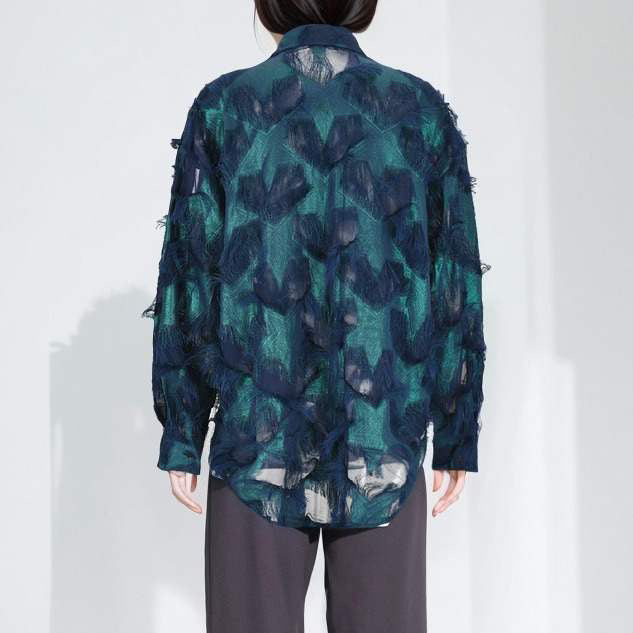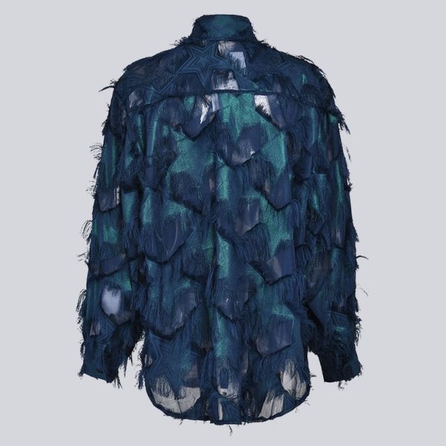 Upplev en unik stil med denna överdimensionerade skjorta som kombinerar klassiska och moderna inslag. Den abstrakta fjädertryckdesignen ger en känsla av rörelse och kreativitet, vilket gör den till ett perfekt val för den modeintresserade.