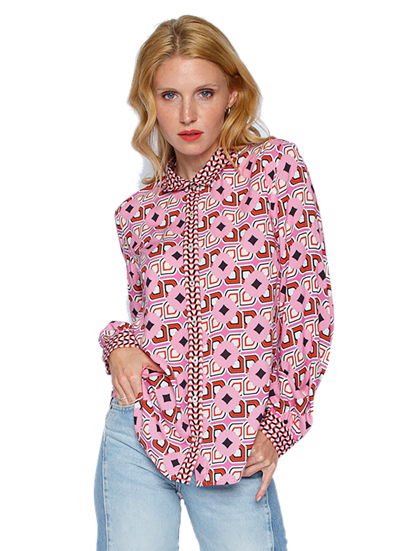 Skjortan har en elegant krage och en rundad nederkant som ger en avslappnad men stilren look. Mönsterblandningen på manschetterna och knapptremsan tillför en unik touch som gör att du verkligen kan sticka ut.