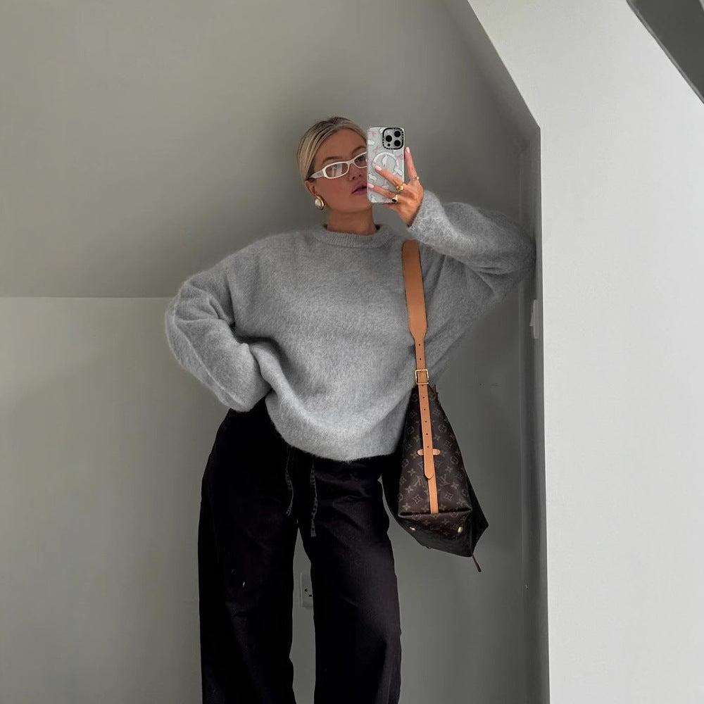 Dam Stickad Tröja Lätt Grobstickad Rund Hals Mjuk Passform