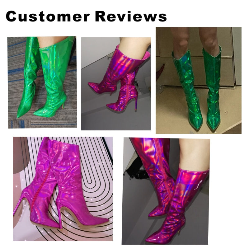 Upplev en känsla av elegans och stil med dessa stilettstövlar som når upp till knäna. Deras förföriska design och avsmalnande form gör dem till det perfekta valet för glamorösa kvällar.