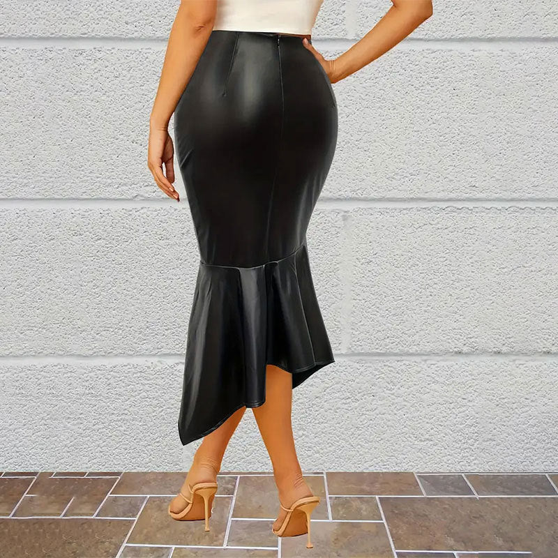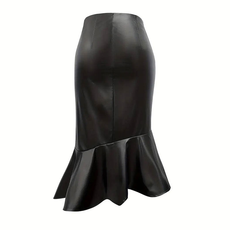 Denna kjol kombinerar en modern design med hög bärkomfort. Det glänsande syntetiska lädret ger en elegant look, medan den figursydda designen med svängande nederkant ger dig rörelsefrihet och stil.