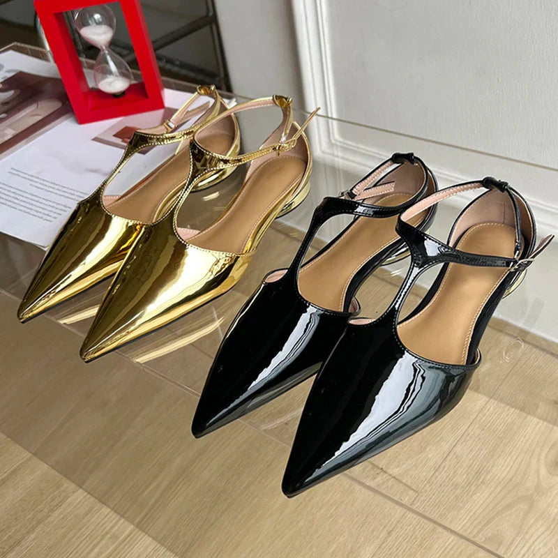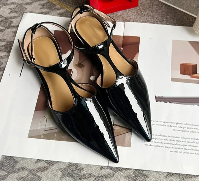 Med en spetsig form och en enhetlig färgdesign, erbjuder dessa pumpar en sofistikerad look som passar både till vardag och fest. Den robusta gummisulans låga häl (1 cm-3 cm) ger en bekväm känsla hela dagen, medan spännstängningen säkerställer att skorna sitter på plats.