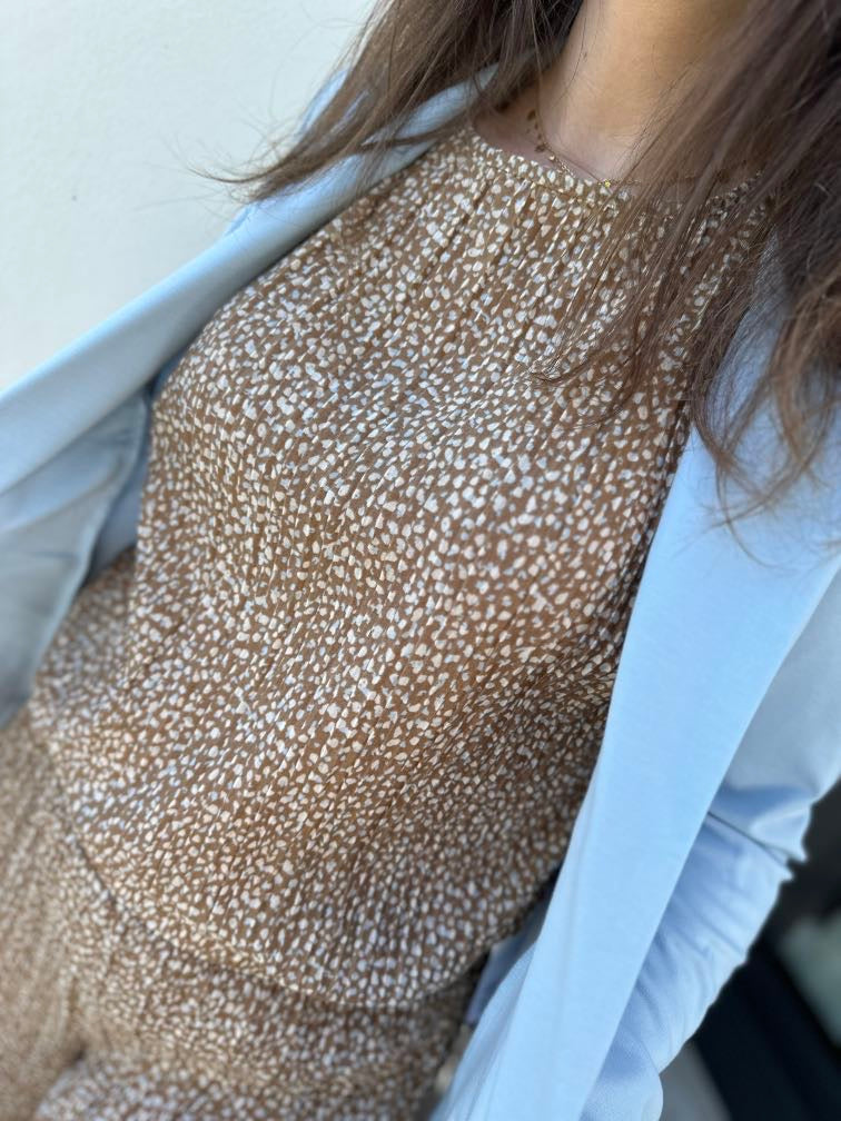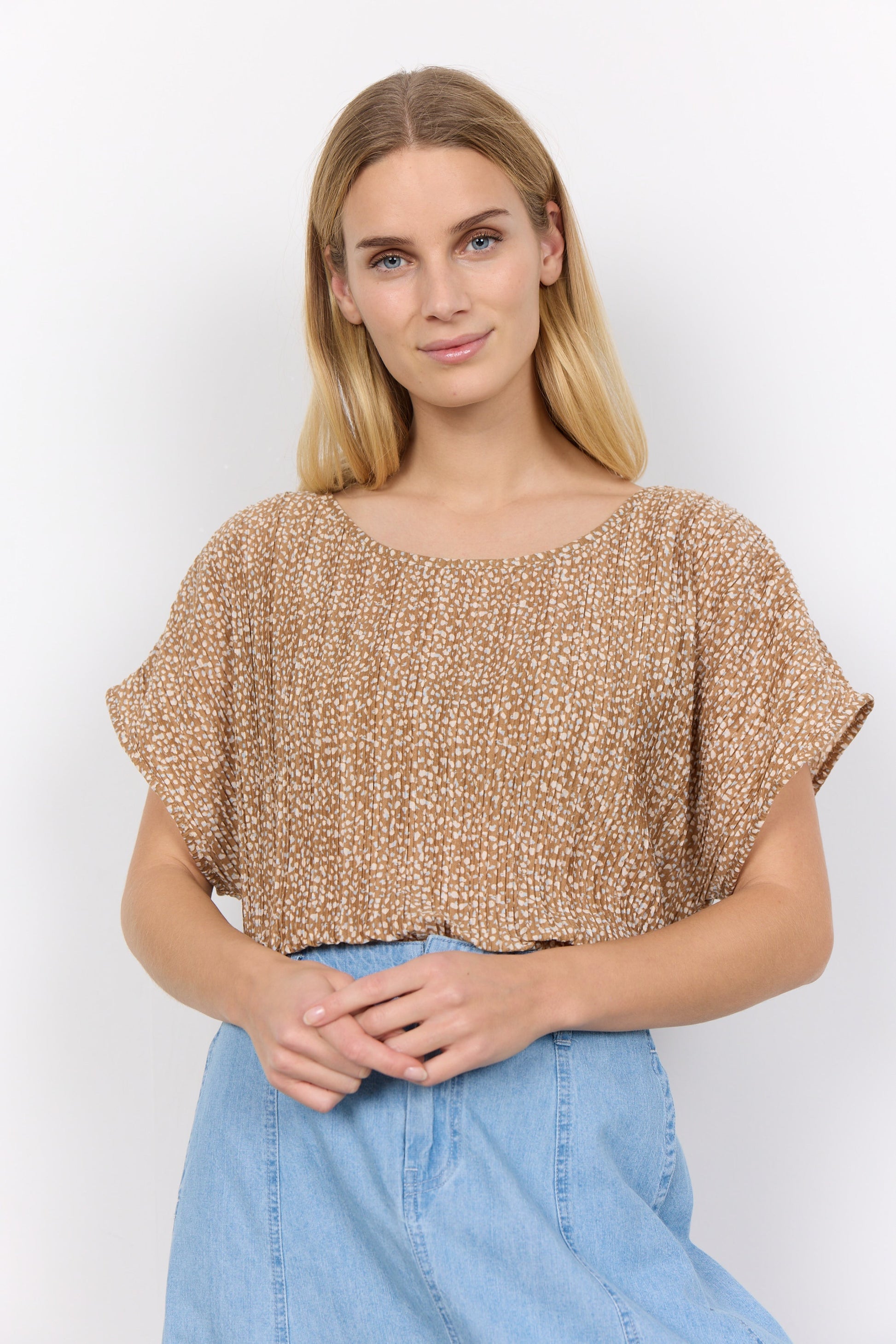 T-shirten har en rund halsringning, korta ärmar och en lös passform som ger en avslappnad och chic look. Den veckade stilen gör den lätt att kombinera med både jeans och byxor för en elegant outfit.