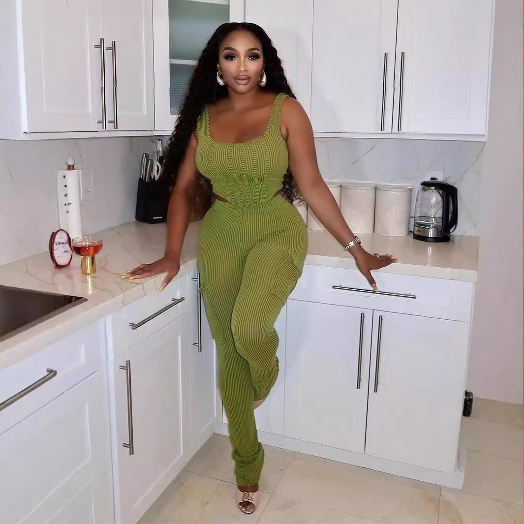 Setet är tillverkat av högkvalitativ polyester och spandex, vilket ger en mjuk och flexibel känsla. Den ärmlösa tank toppen och de långa byxorna gör det till ett utmärkt val för både vardag och fest.