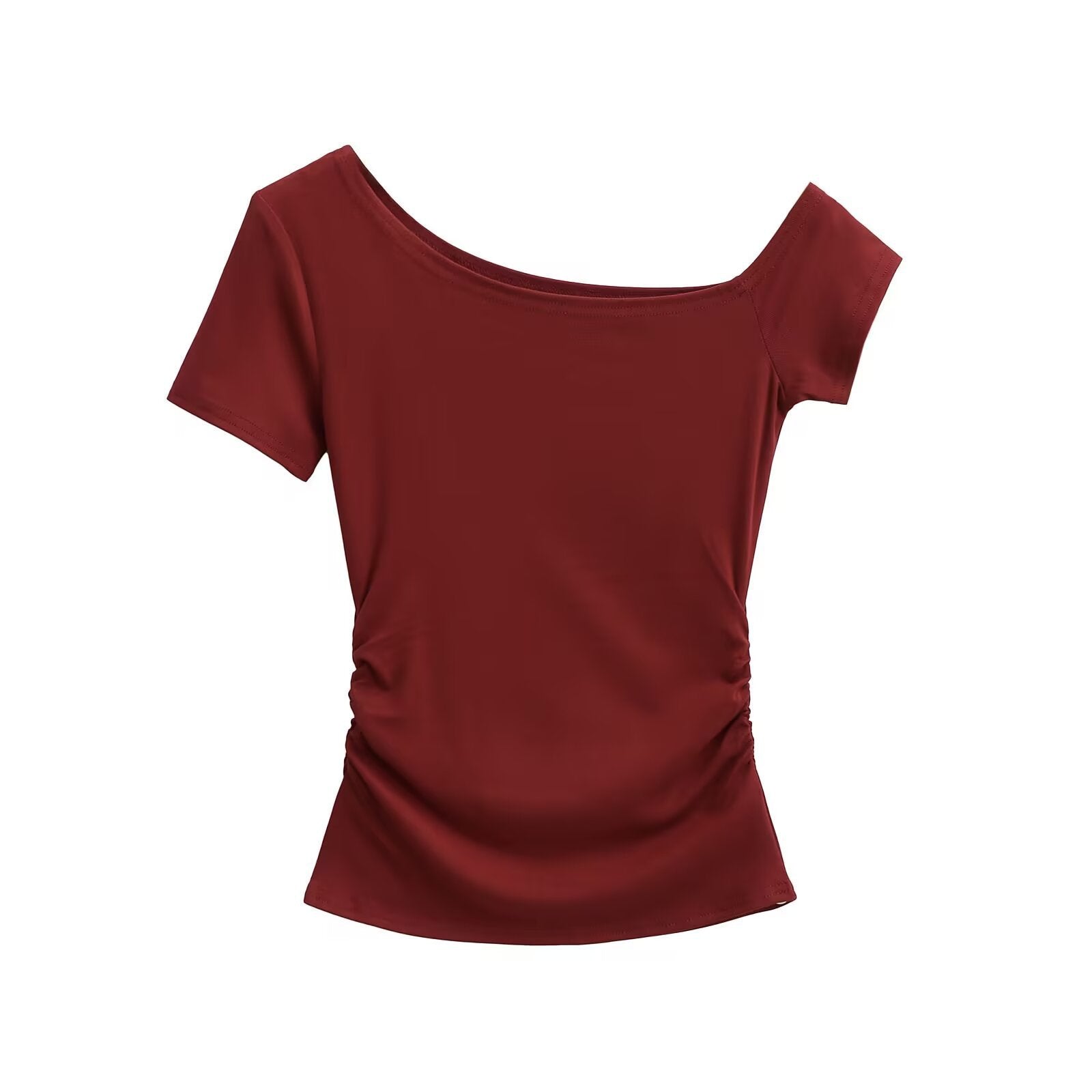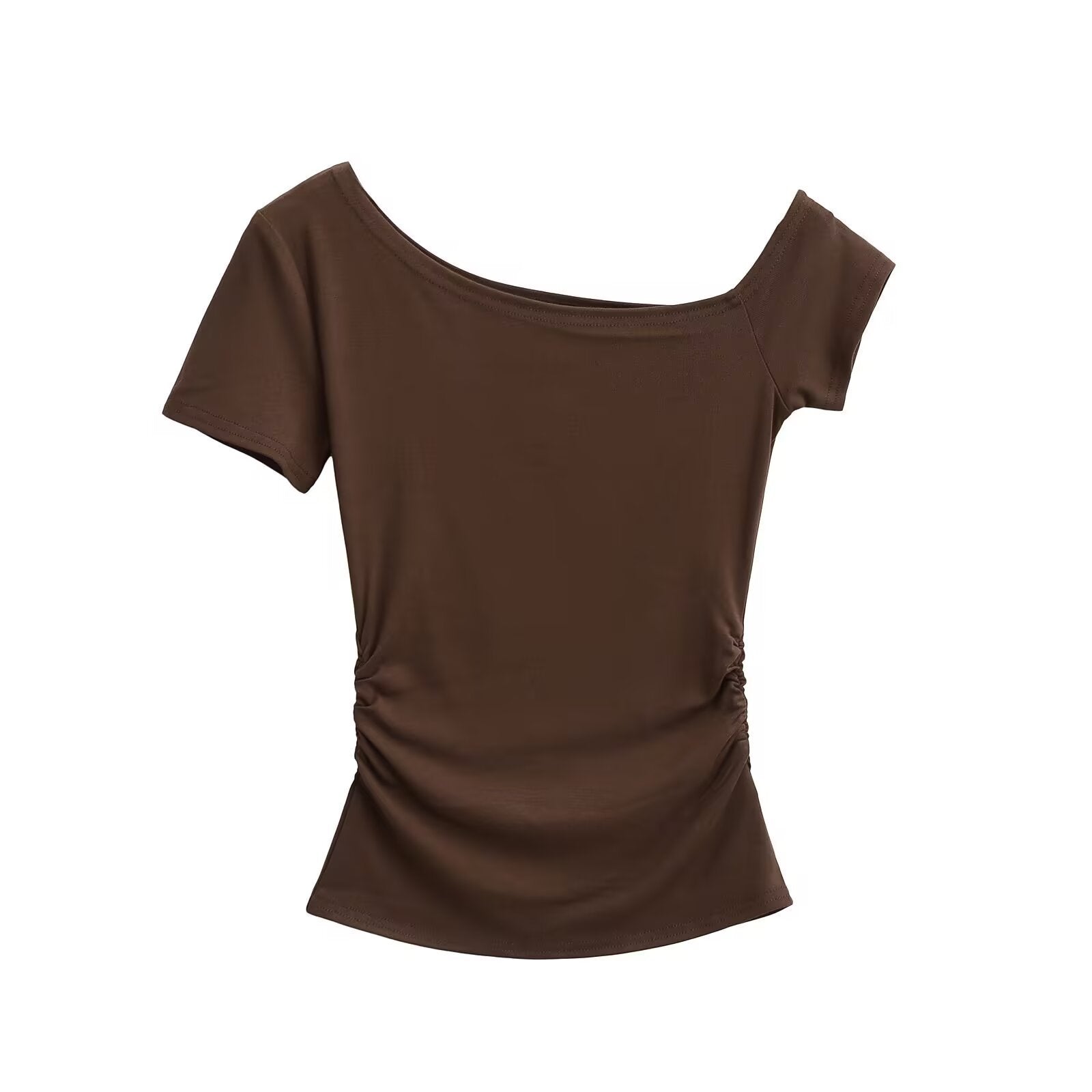 Upplev en perfekt kombination av stil och komfort med denna damtopp. Den asymmetriska halsringningen och den elastiska samlingen ger en modern känsla som gör att du känner dig självsäker och elegant.
