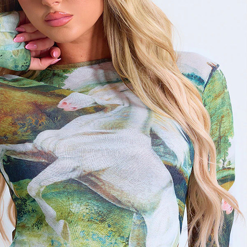 Upplev en unik stil med denna grafiska topp som verkligen fångar ögat. Den mystiska enhörningen ger en fantastisk touch som gör att du känner dig speciell varje gång du bär den.