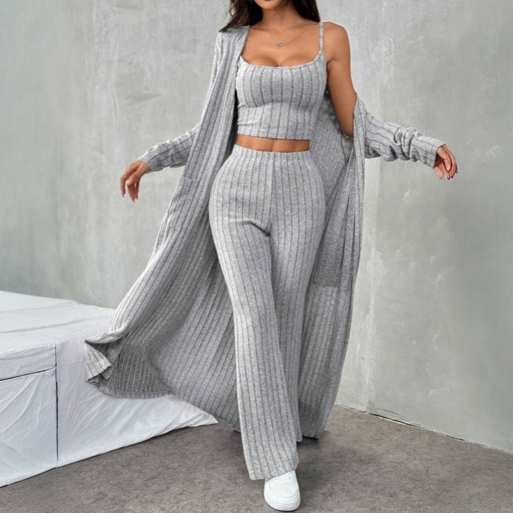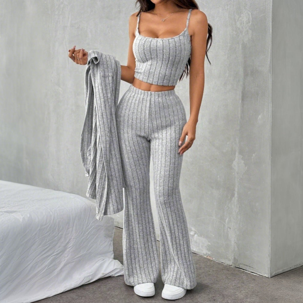 Upplev komfort och stil med denna tre-delade set som är perfekt för avkoppling hemma. Den mjuka och lätta designen gör att du känner dig bekväm hela dagen.