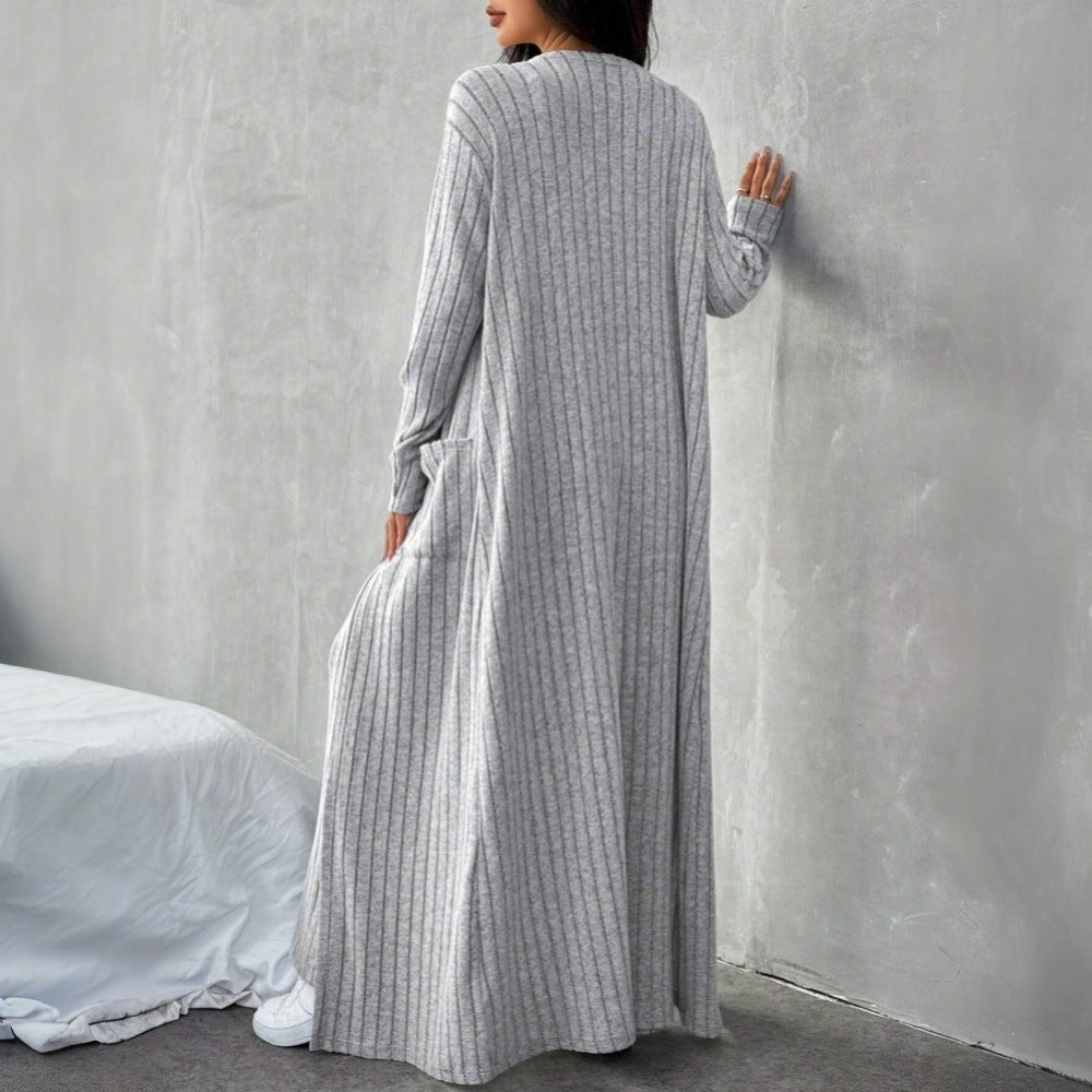 Setet har en monokrom grå färg som ger en tidlös och elegant look. Med sina regelbundna ärmar och slim fit-design är detta plagg idealiskt för både avslappnade stunder och hemmamöten.